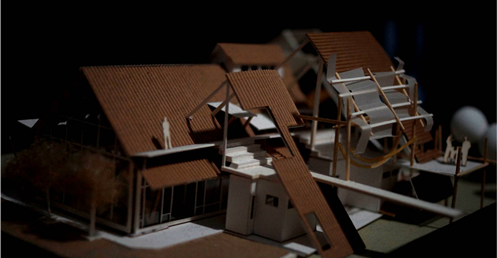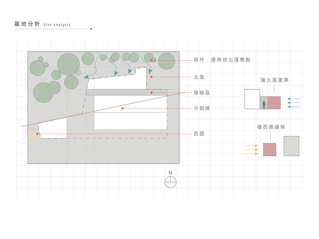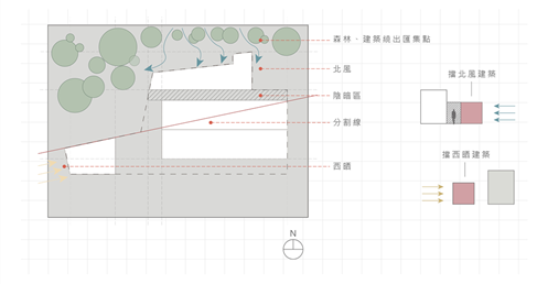 設計一開始我考量的是既有建築的事情,北向原先為長向的建築,西向則有一棟小的建築,整體核心為中心的長方型的四面落地窗建築,而西北巷則有森林包覆。