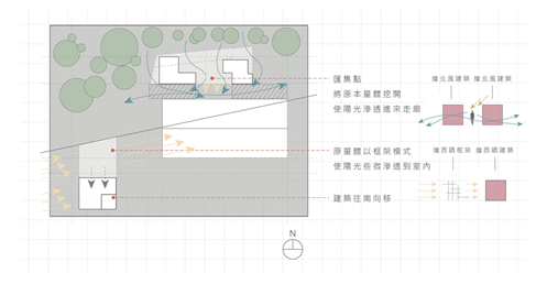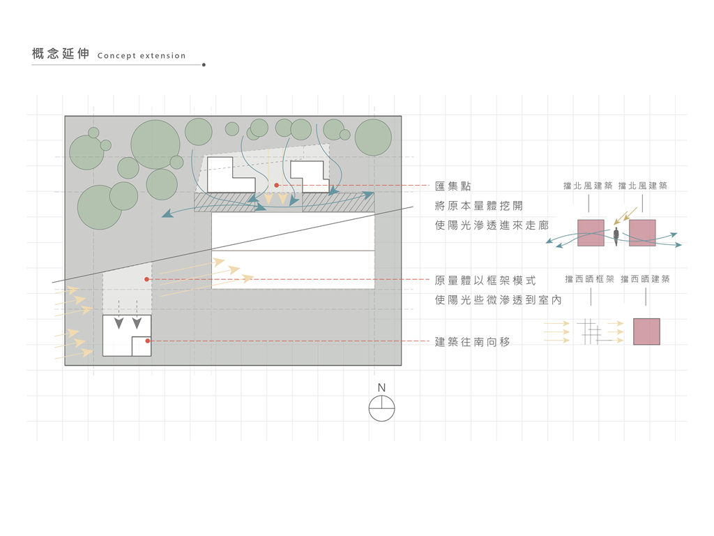 「北向」長向建築劃分成兩塊量體,中心成為一個廣場,種植樹木,引導光線與風流動於走廊,增加光線進入。