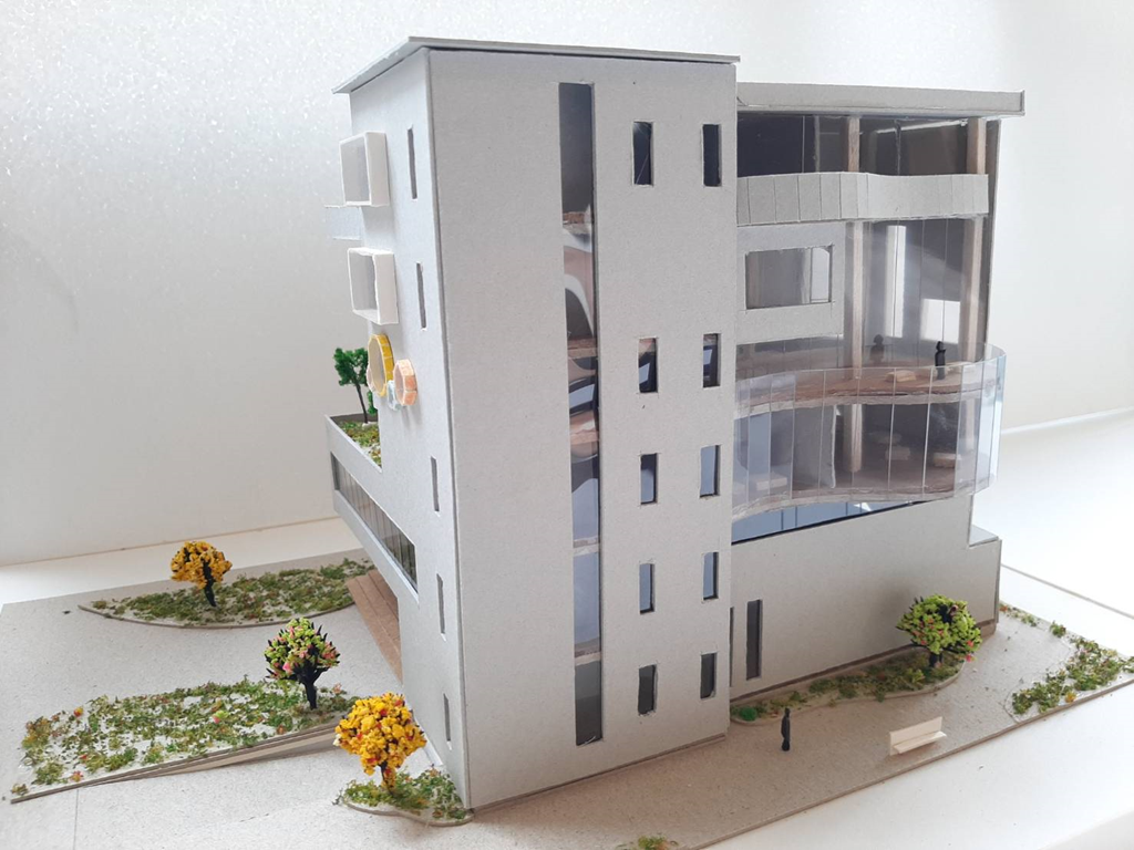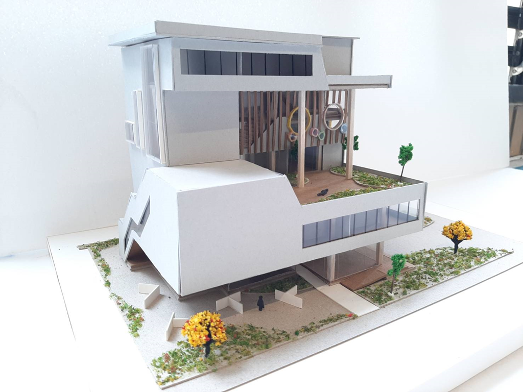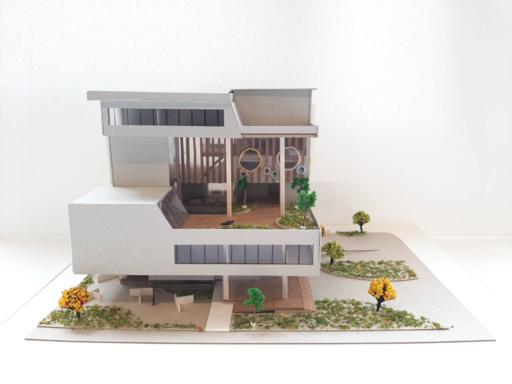 上層的量體透過拖出80公分的水平及垂直,不同大小的窗,來優化室內空間的使用,也讓立面與圓形拖出語彙有所呼應。