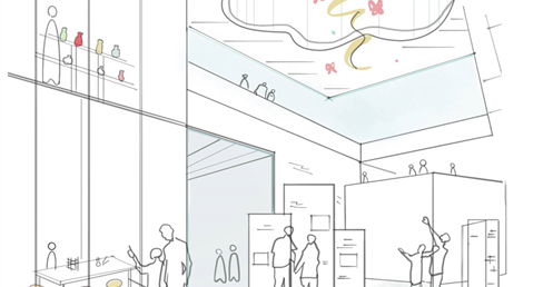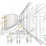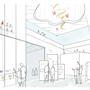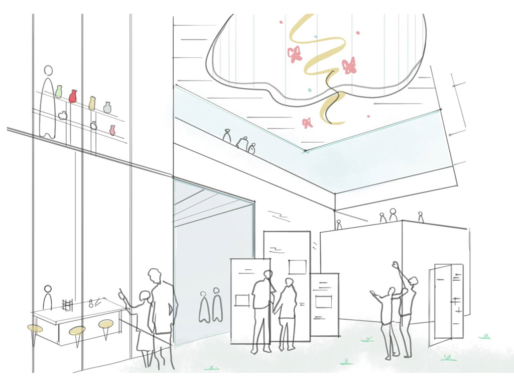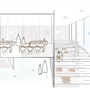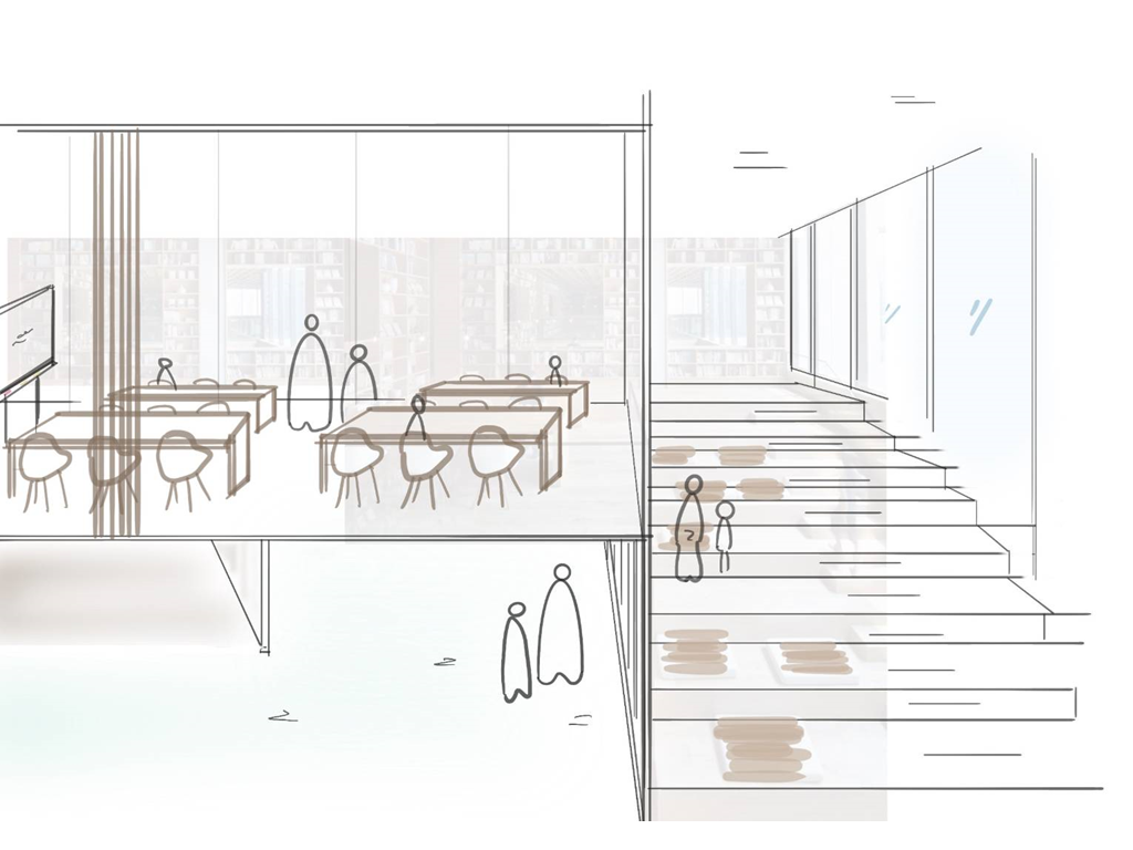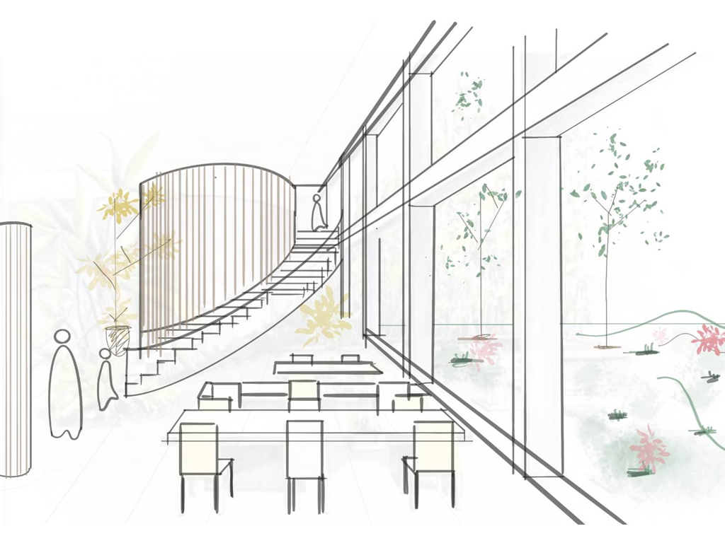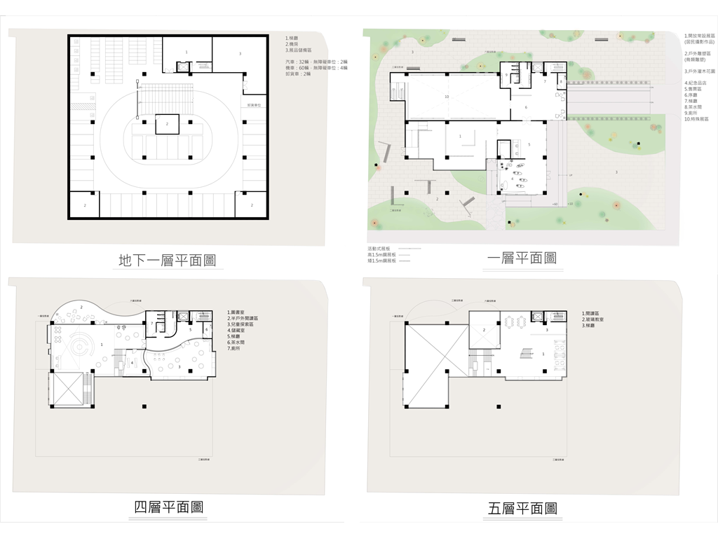 地面層西向沿街面透過鳥類雕塑區與灌木花園引導人至建築物內,也能透過玻璃帷幕看見紀念品商店;從東向的小巷子可以透過垂直長向開窗隱約看見內部的特殊展區。