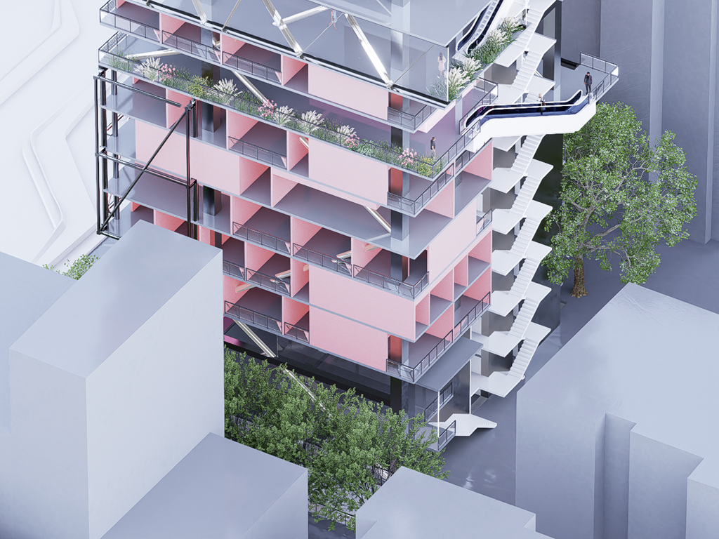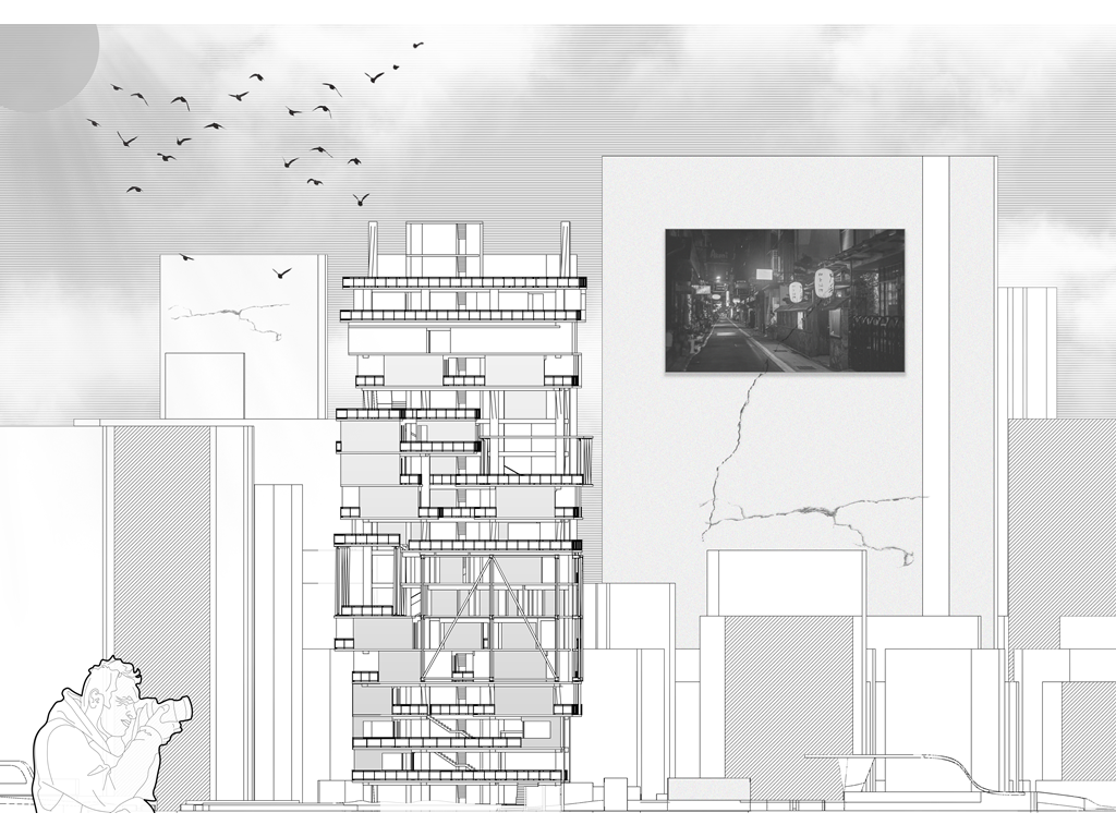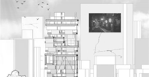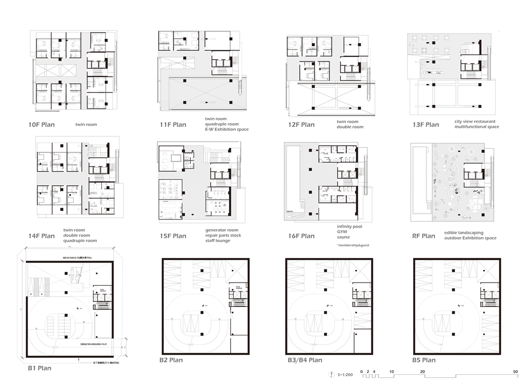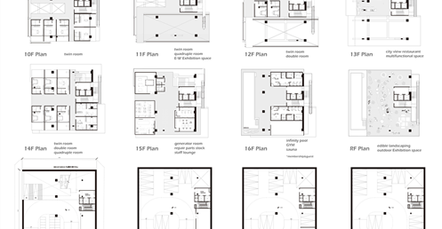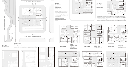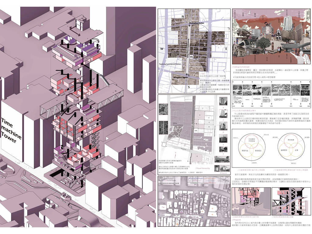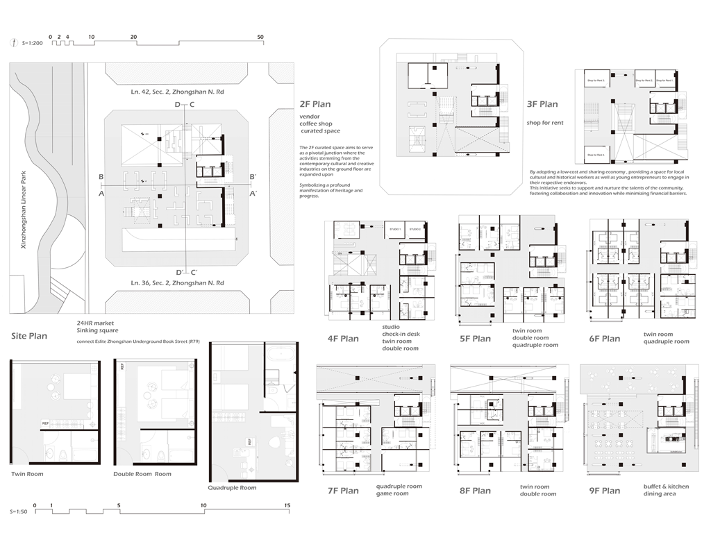 我試圖抱持著開放、靈活、具前瞻性的態度去建構出一處紀錄中山快慢、新舊之間的容器並對當代藝術策展空間提出在地性的疑問......。我利用視角框景與參觀迴路的手法,分別在2F、8F、12F置入高度四公尺以上的透明策展空間,分別對應民國時期的1972年、1957年,以及1950年美軍顧問團抵台時期。企圖利用迴路轉折的手法,從底層的當代文創活動做為起點走回頂層的歷史框景路徑,讓時光倒退回西元1916年代的中山敕使街道,並且打破傳統複合式旅宿空間的住商界限。