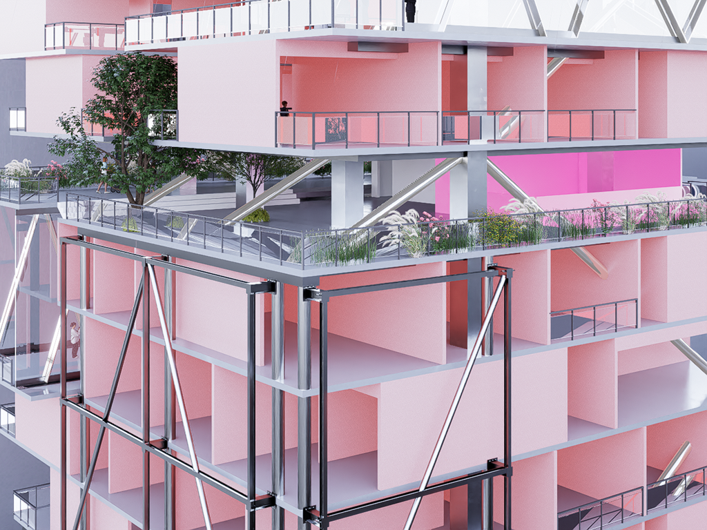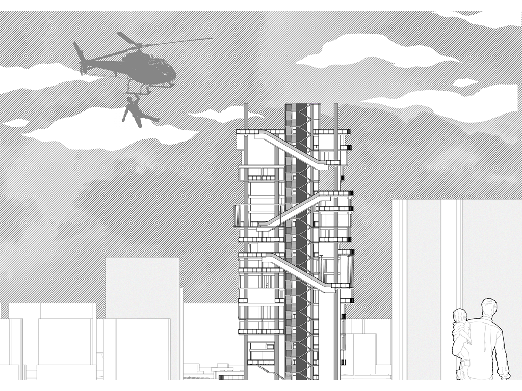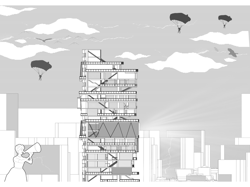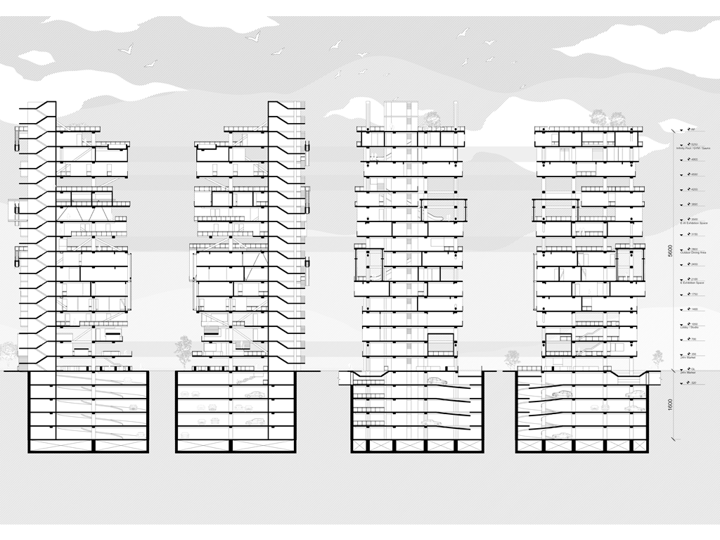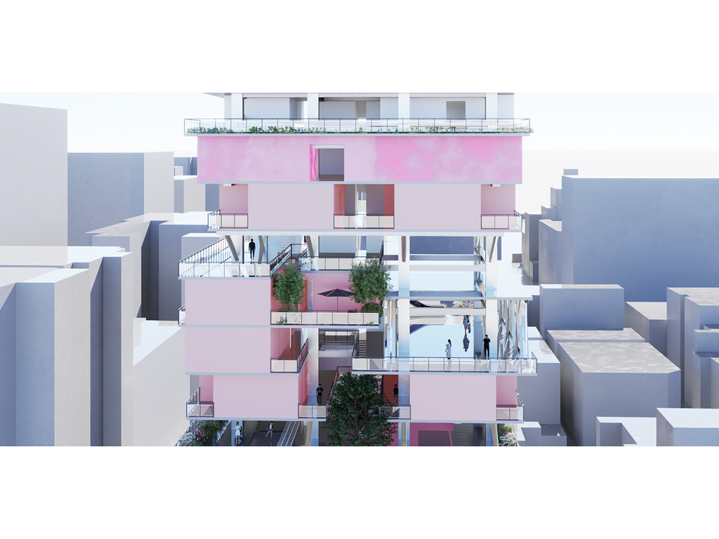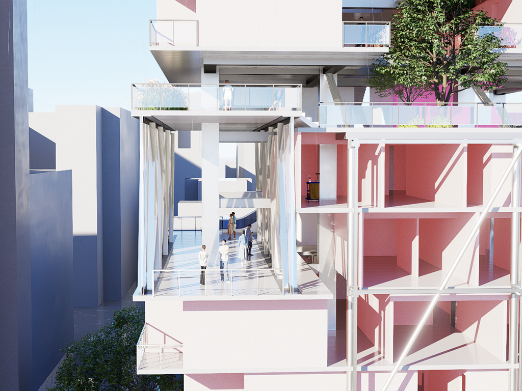 我試圖抱持著開放、靈活、具前瞻性的態度去建構出一處紀錄中山快慢、新舊之間的容器並對當代藝術策展空間提出在地性的疑問......。我利用視角框景與參觀迴路的手法,分別在2F、8F、12F置入高度四公尺以上的透明策展空間,分別對應民國時期的1972年、1957年,以及1950年美軍顧問團抵台時期。企圖利用迴路轉折的手法,從底層的當代文創活動做為起點走回頂層的歷史框景路徑,讓時光倒退回西元1916年代的中山敕使街道,並且打破傳統複合式旅宿空間的住商界限。