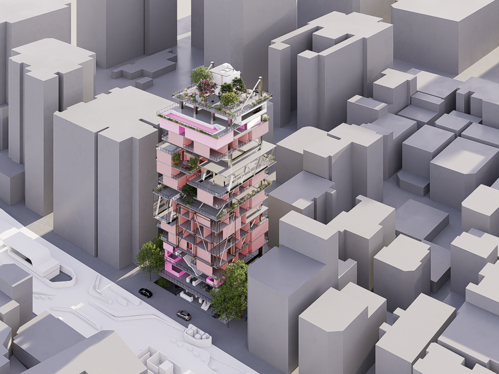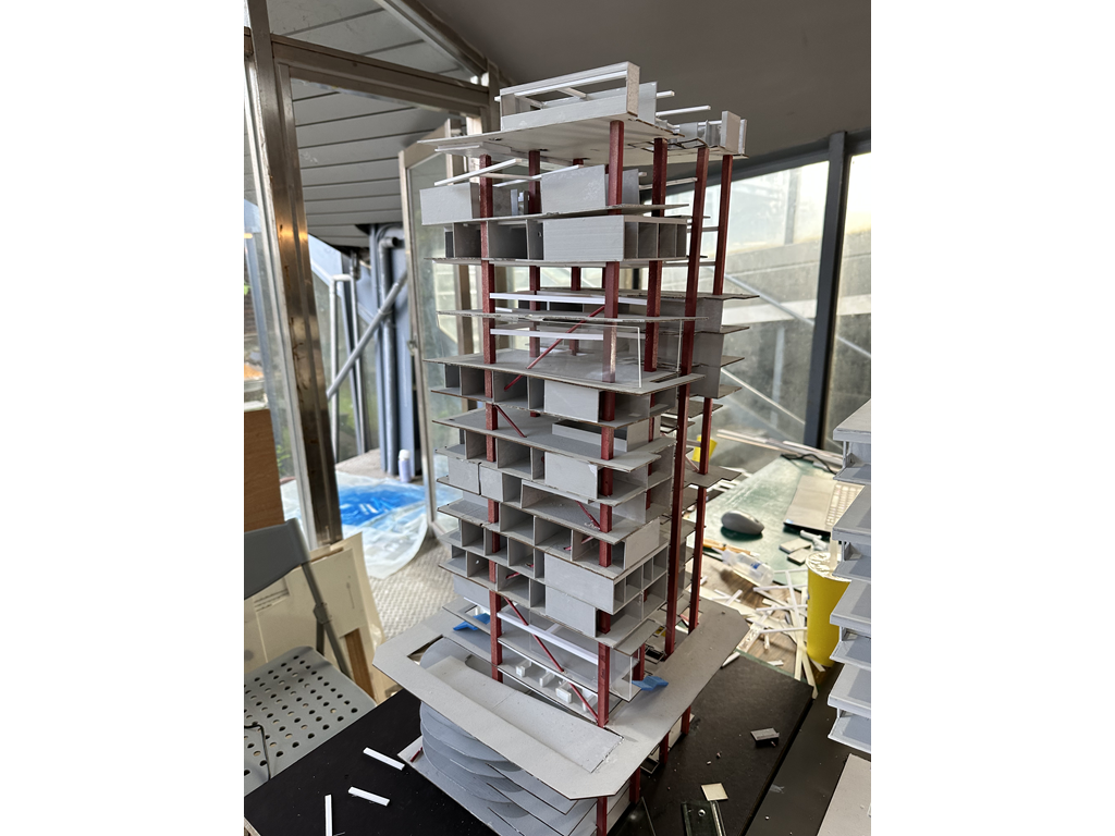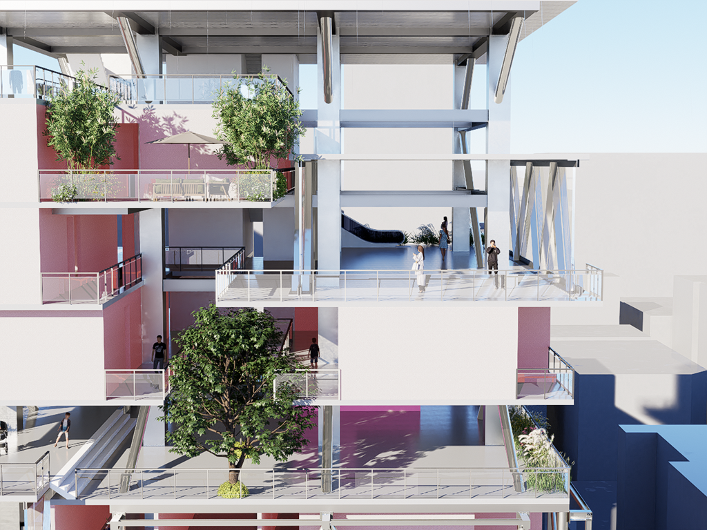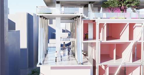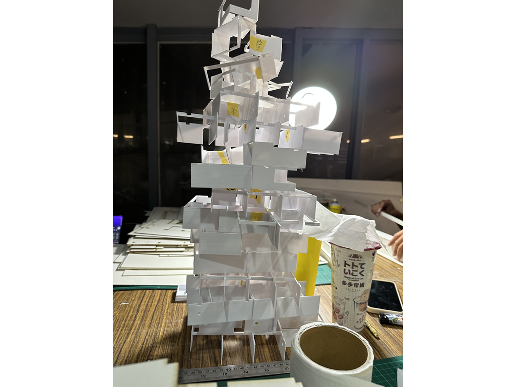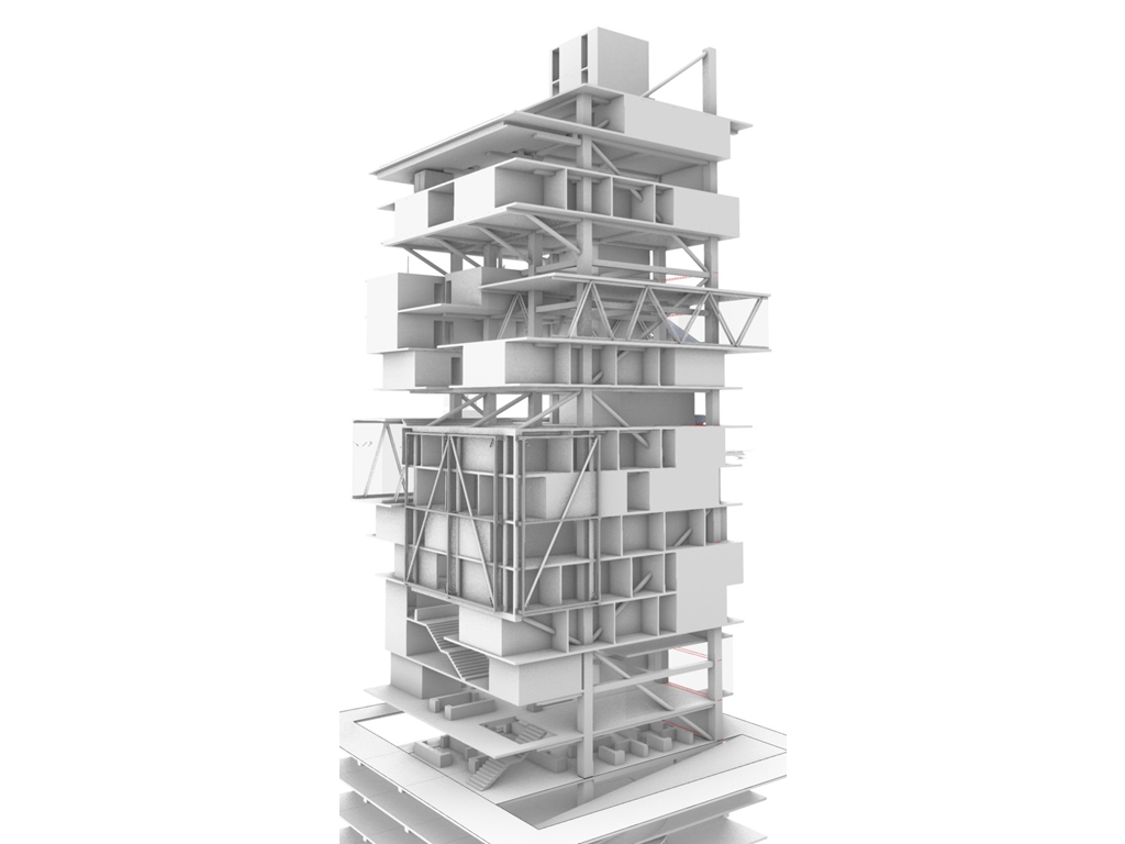 我試圖抱持著開放、靈活、具前瞻性的態度去建構出一處紀錄中山快慢、新舊之間的容器並對當代藝術策展空間提出在地性的疑問......。我利用視角框景與參觀迴路的手法,分別在2F、8F、12F置入高度四公尺以上的透明策展空間,分別對應民國時期的1972年、1957年,以及1950年美軍顧問團抵台時期。企圖利用迴路轉折的手法,從底層的當代文創活動做為起點走回頂層的歷史框景路徑,讓時光倒退回西元1916年代的中山敕使街道,並且打破傳統複合式旅宿空間的住商界限。