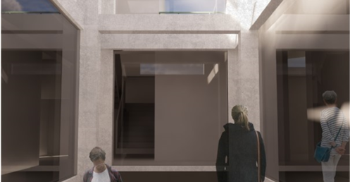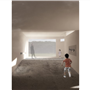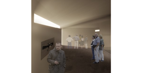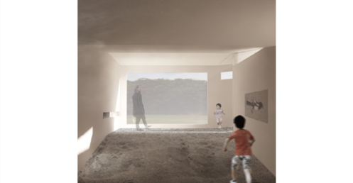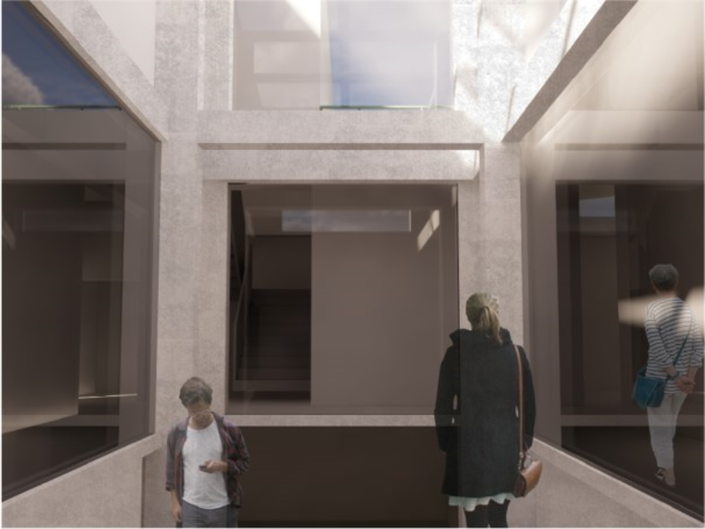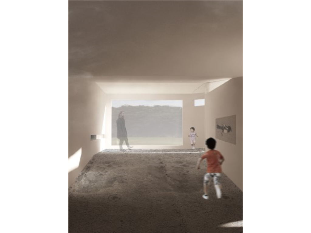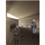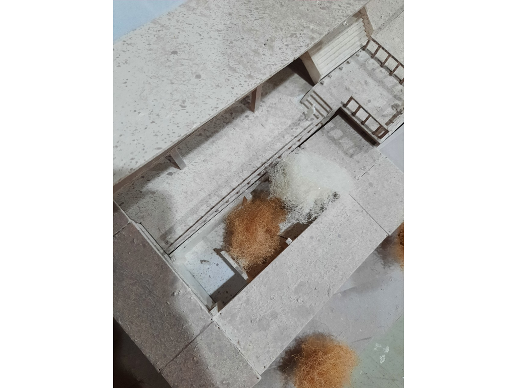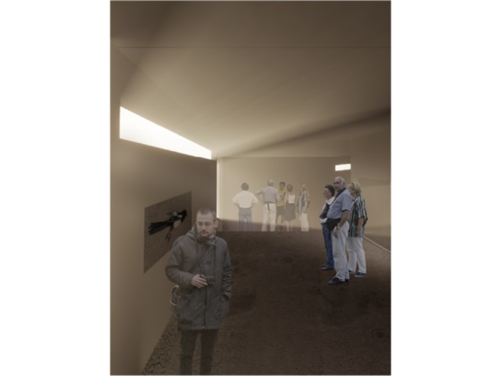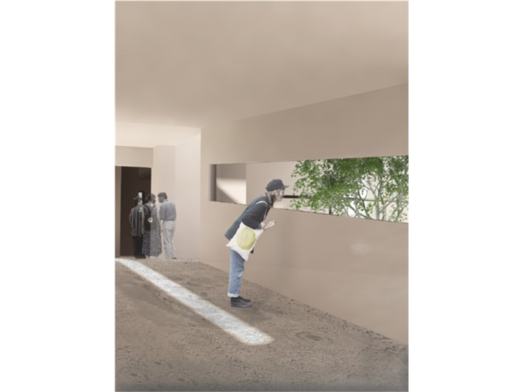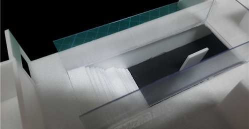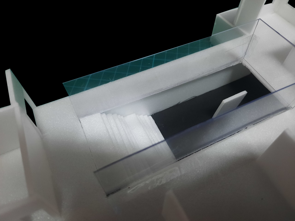 往B1的入口設置在1F中央並透過階梯往下移動,然而室內高度僅有2.5M讓低矮且壓迫的感受湧入參觀者的思緒,同時階梯上面有著挑空兩層的開口讓光能透過時間的流動以不同的光線穿入並帶入B1。