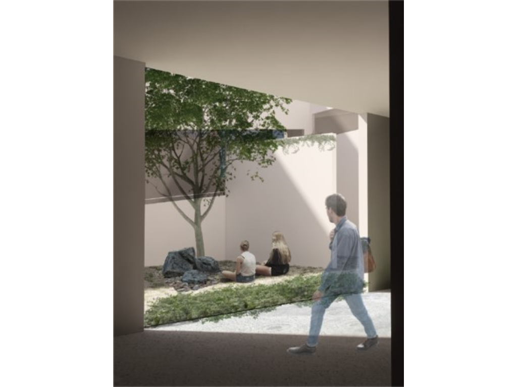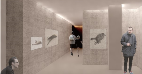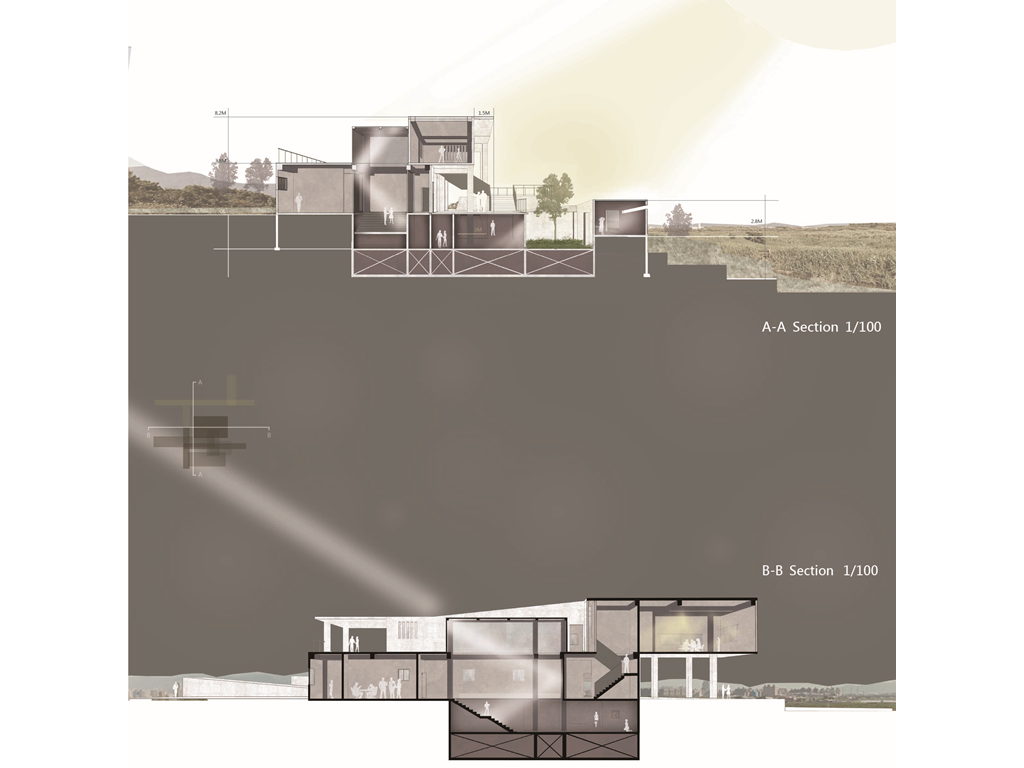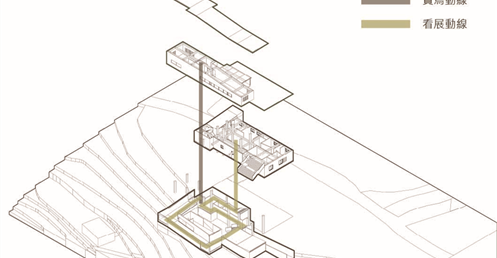 B1的參觀迴路中有著多個開口連接到戶外及大型社交性空間,透過迴型動線的坡道將參觀者往上做引導並透過各種開口框景去表達自然,參展動線會一路連接到1F,方便連結到其他空間上。