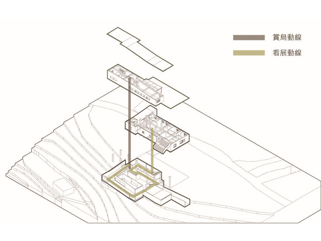 以候鳥的生命循環作為主軸,在游走空間的同時感受鳥類生命的變化,同時參觀迴路讓保護自然生態的資訊能夠清晰地被放大,並且在游走各種空間的過程中能有著與自然互動的關係存在。