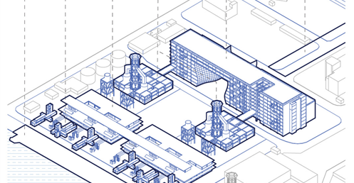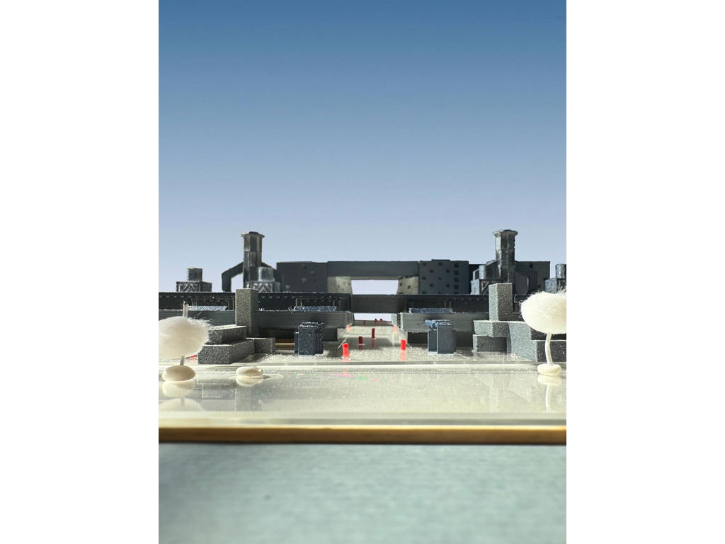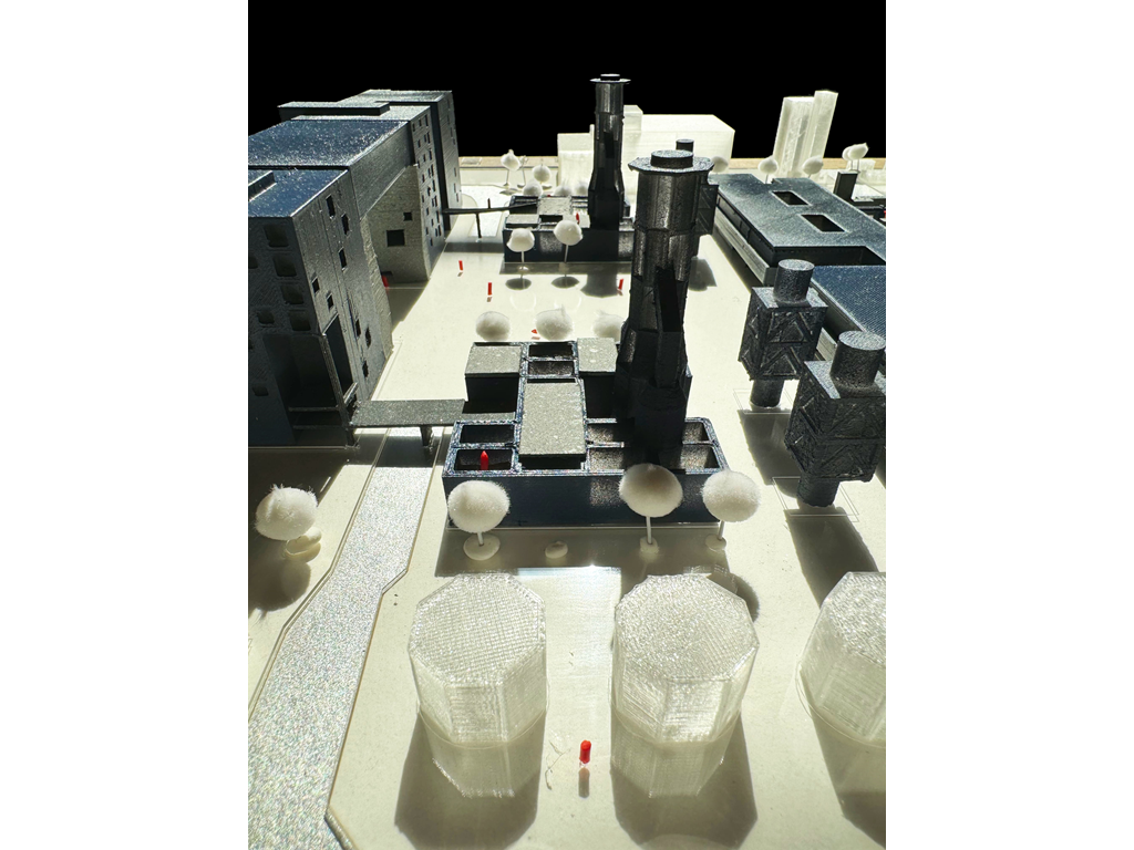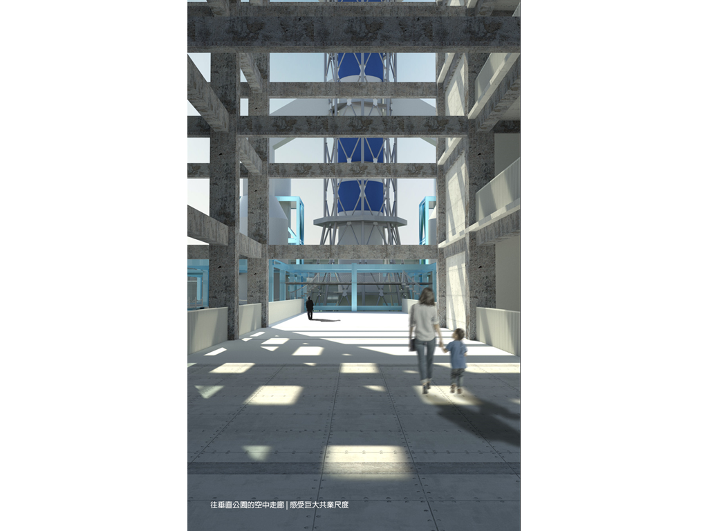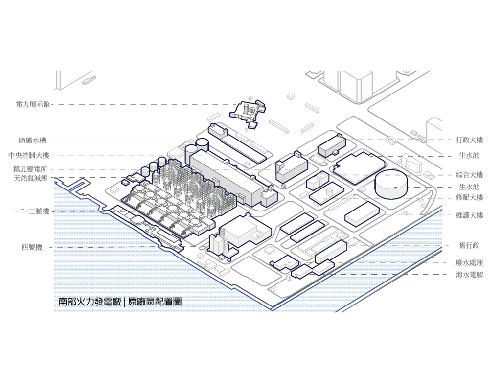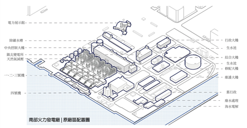 而此設計的基地,即為這沿海帶狀的末端,一座經變更用地準備廢棄的火力發電廠,在此基礎上,本設計將闡述另一種高雄港區開放,與都市記憶接軌的可能性。燃氣為主、因排放大量甲烷造成許多不安的發電廠將廢除,期望透過量體操作的強烈軸向性,將港岸邊奔向海洋以及擁抱城市。