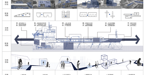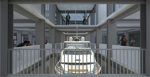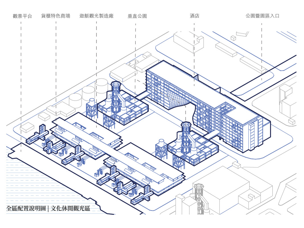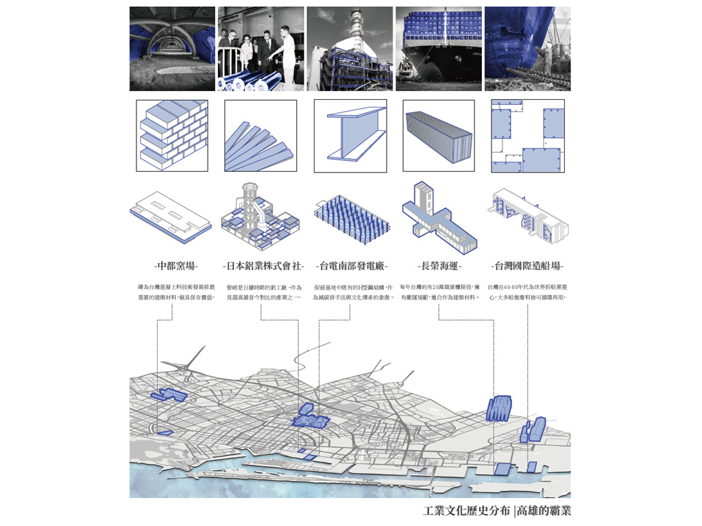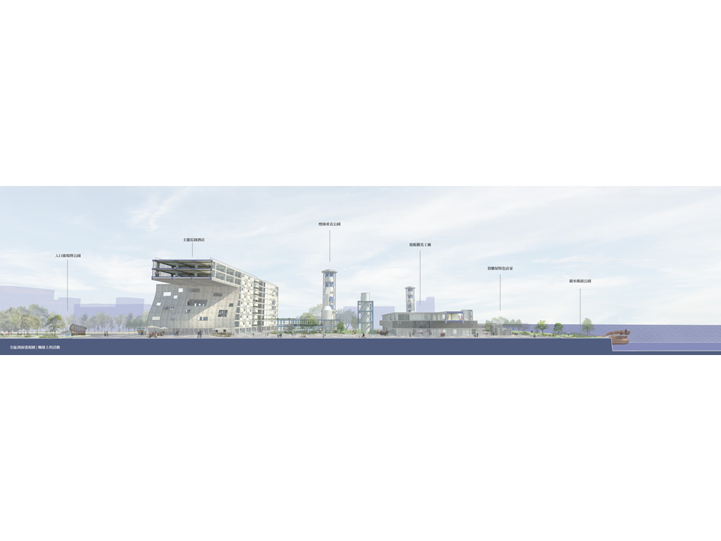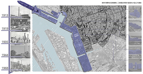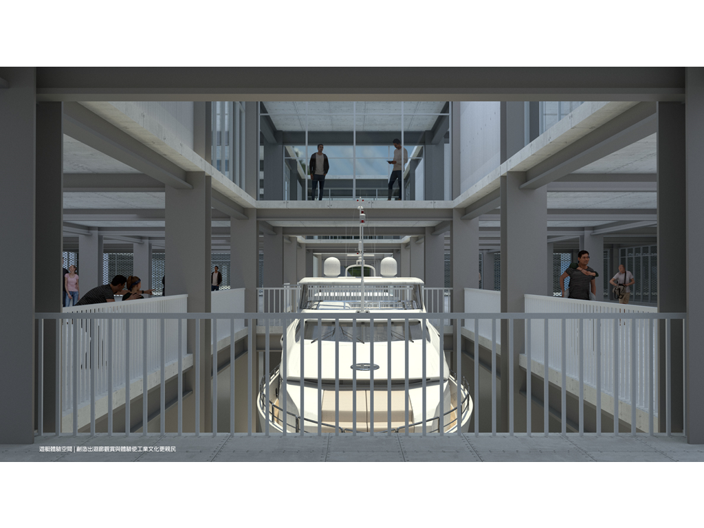 近年高雄借鏡國際城市經驗,期望藉由公共設施,讓高雄成為有文化的宜居城市。但新興建物如何保有本土價值呢?目前高雄遊艇製造業位居全球第四,本設計在舊工業發源遺構引入此產業,增加觀賞趣味性,讓原工業成為文化提醒、也讓興盛的遊艇製造業融入市民的生活中。