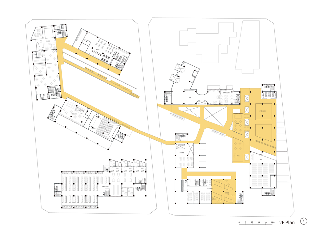 從底層播放電影的多媒體空間、桌撞球間、沙發或圓桌交誼區、簡易廚房和共食空間到最頂層的都市農園,依對光照的需求及動態靜態區分,並以垂直動線作為活動之間的過渡。