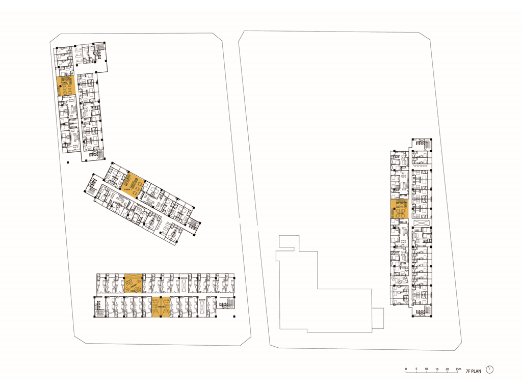 鄰近公園出入口處,一樓為餐飲空間,二樓為健身房;基地西側屬於健康照護機能,一樓有診所、藥局、樂齡中心,二樓為幼兒園及親子餐廳。基地正中央被富北街分隔的兩棟樓基座皆屬於社區公共機能,包括講堂、圖書空間、包裹收發、美術教室等。北門路側為出租商業空間,北忠街側是超市以及宿舍棟一二層的共享工作空間。