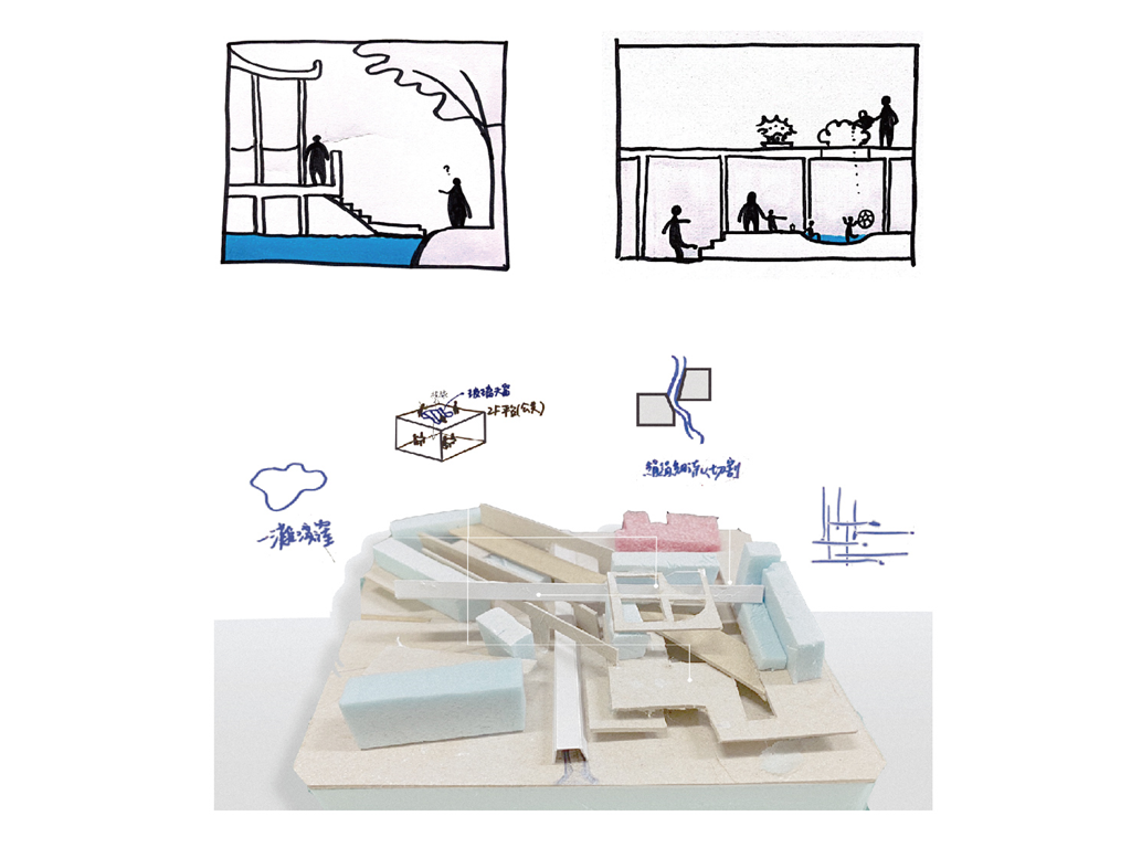 台南公園的水可看而不可及,我們希望生活中能有淺而定期清掃的水景,既能接觸也能觀賞。在水景及二樓平台的形體規劃中我們使用從水的聯想裡提取的形式如線性切割及視線穿透。