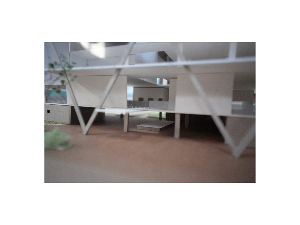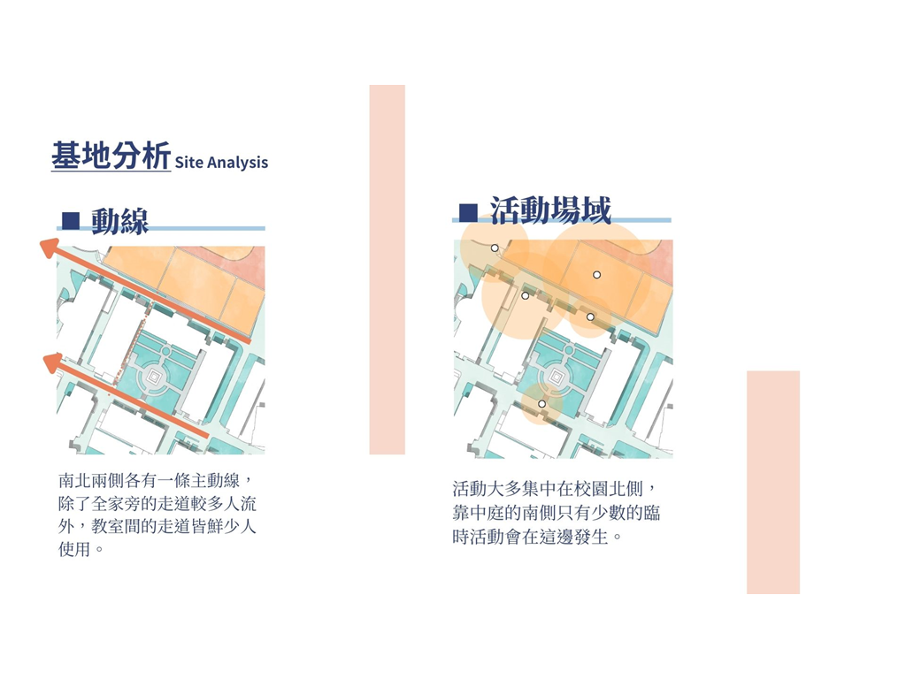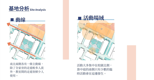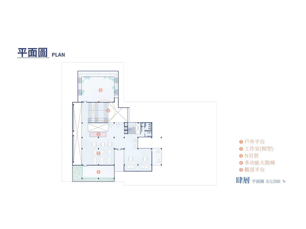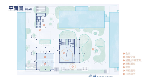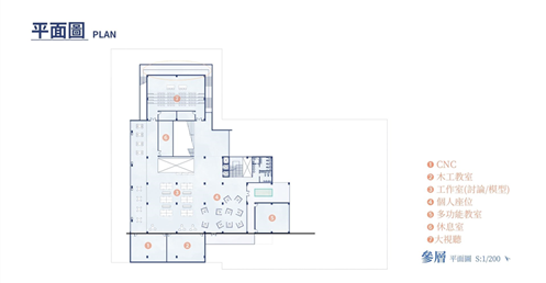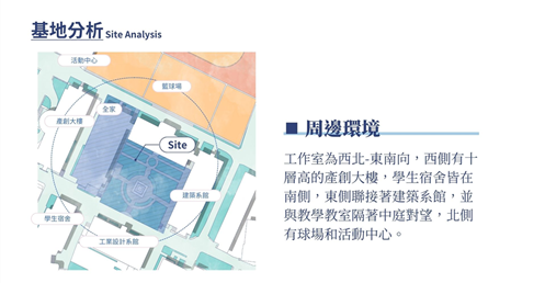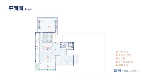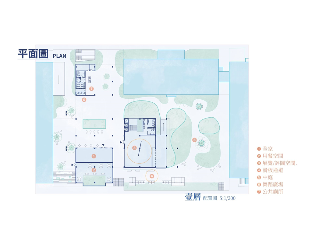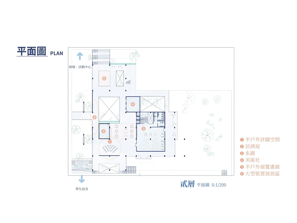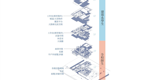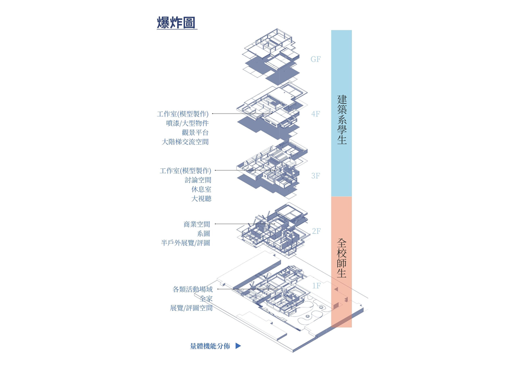 地面層的解放:由建築系的活潑性為出發點,考量基地位在校園學生活動最熱絡的區域,將地面空間留白,以容納更多元的學生活動。而滑板通道提供原本在工設系館前不同形式的活動場所,利用坡道替代一般座位,讓觀眾更能與表演者產生更多互動。