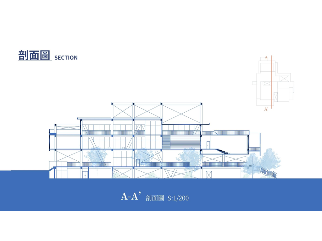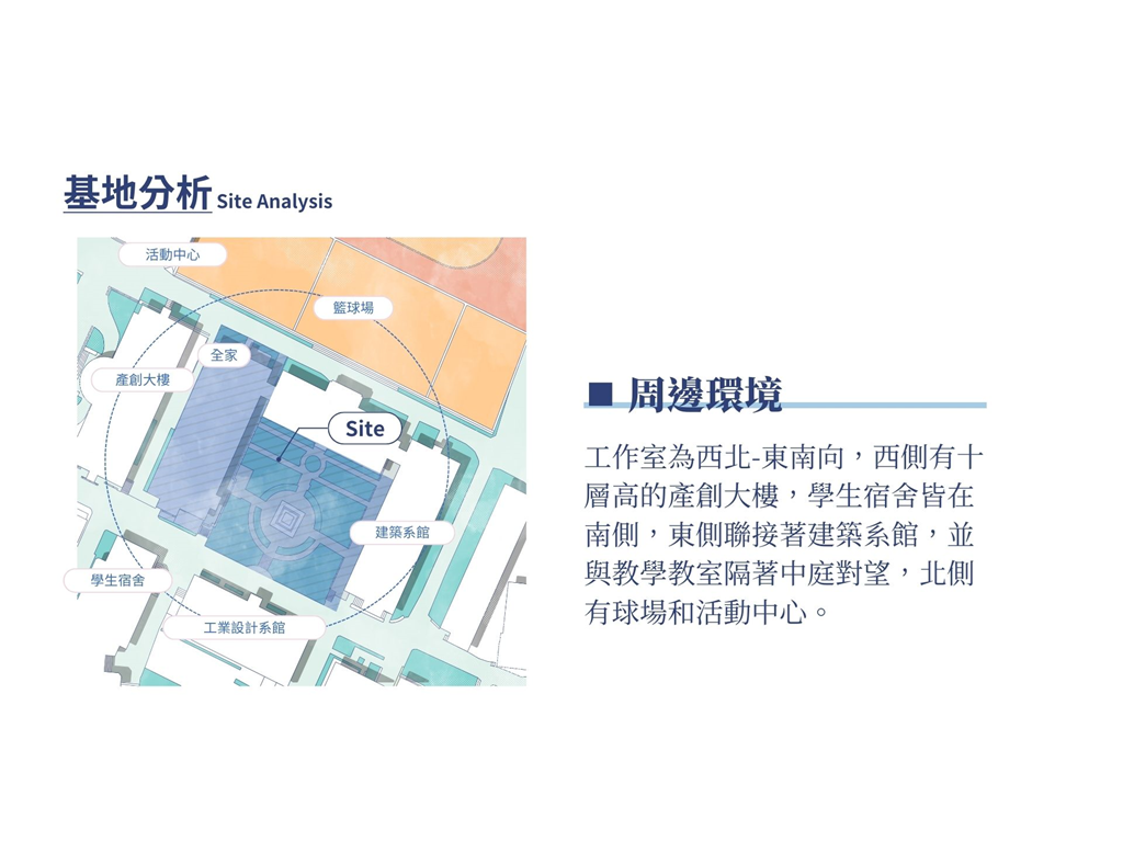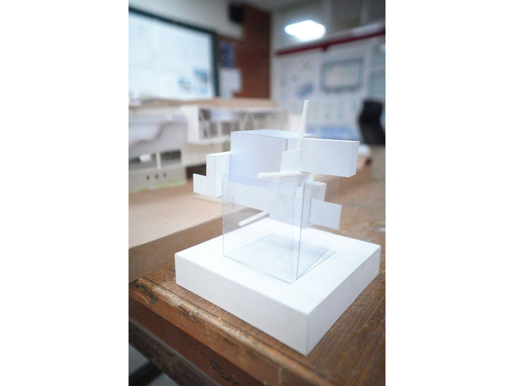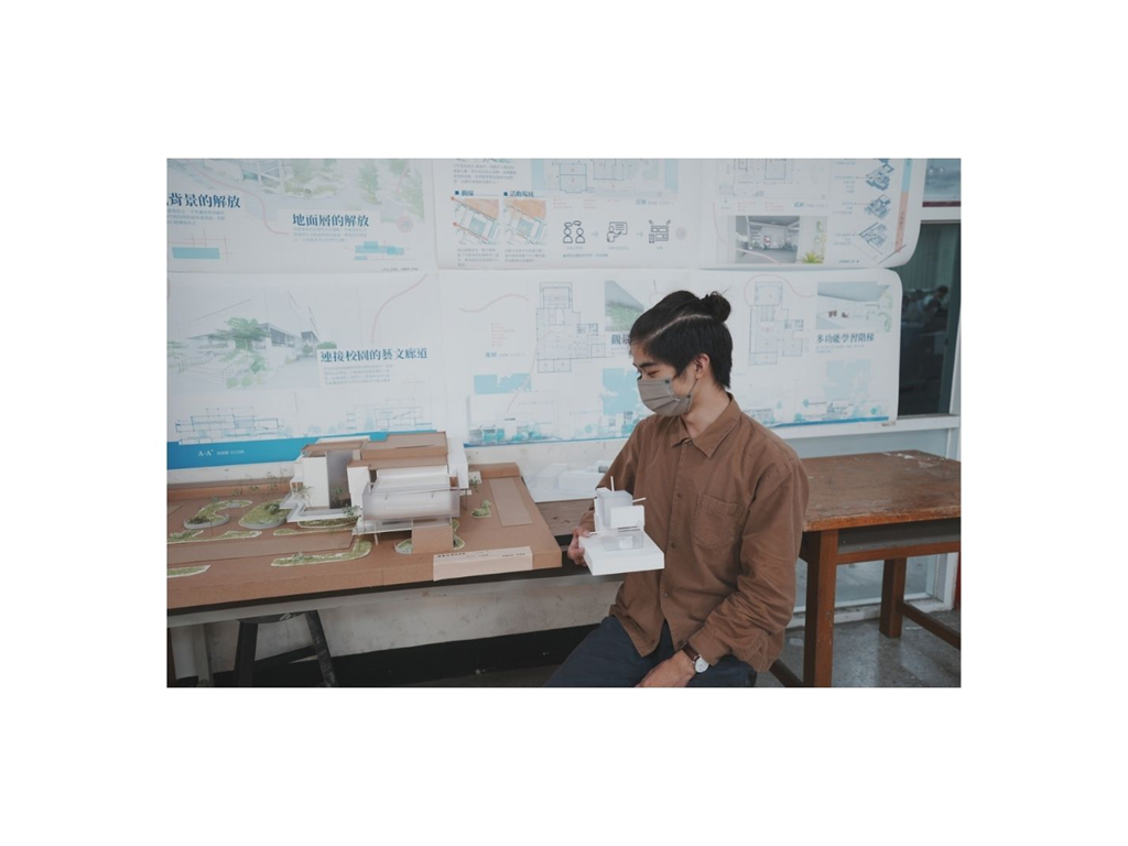 本次設計以改造聯合大學建築系館工作室為址,進行空間、立面的改造。我認為大三是做為建築修煉者的一個分水嶺,歷經兩年的磨練後,將所學內容實踐在設計,提出一個完整的作品的開端,因此有了序論一說。現在將眼光放回自己生活的地方,讓我重新思考自己心目中所追求的建築,究竟是什麼形式、樣貌的,最後得出了:想創作出具有獨特性,與眾不同的建築。因此期許能"解放"自己的想法,提出更創新的建築。概念模的表達上是以數個不同程度開放的量體鑲嵌在一起,呈現出解放是一個循序漸進的過程,並非只有一跟零兩個面向,因此在東向立面能明確看到不同程度開放的空間關係。