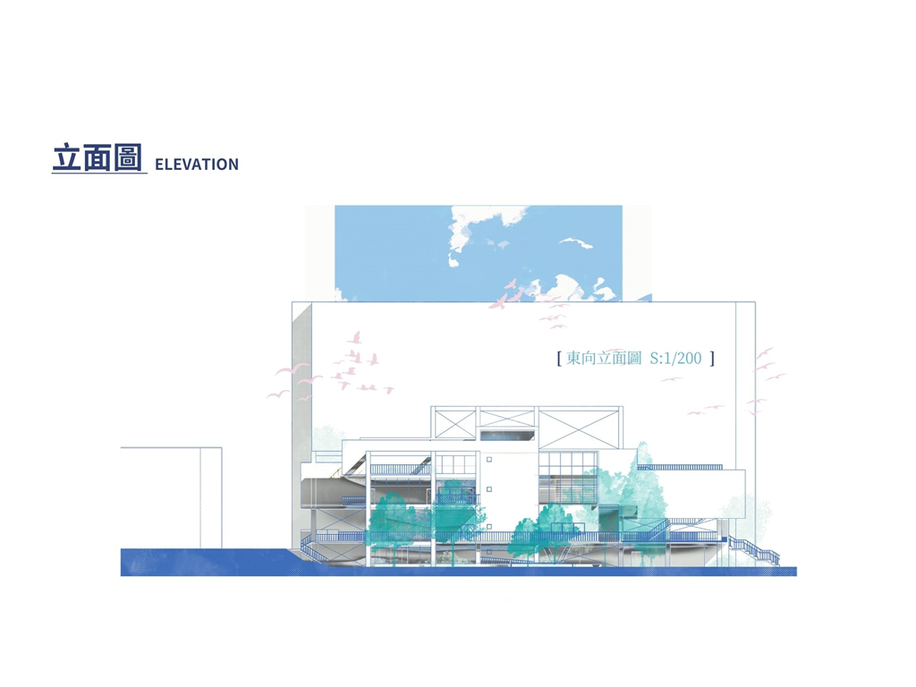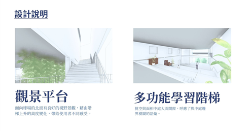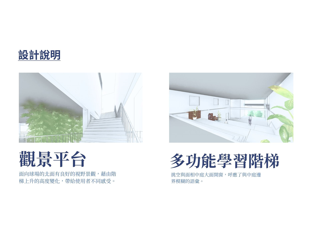 觀景平台:面向球場的北面有良好的視野景觀,從外部能直接上到三樓的屋頂露臺,藉由階梯上升的高度變化,帶給使用者不同感受。