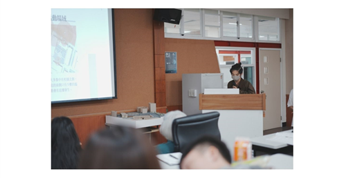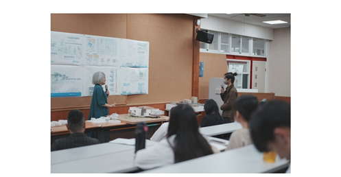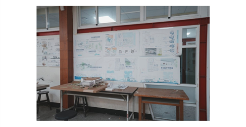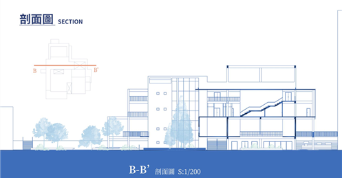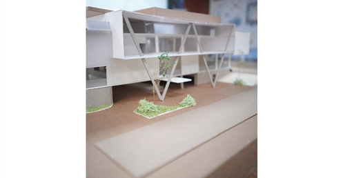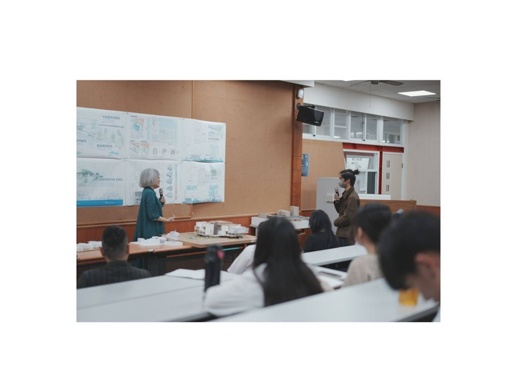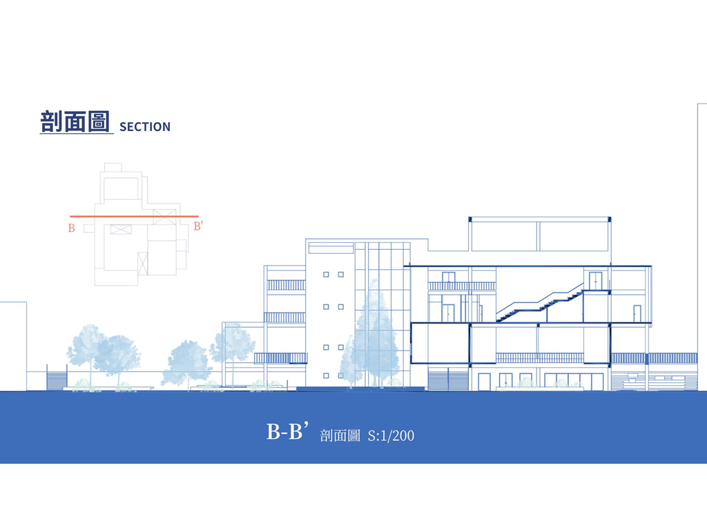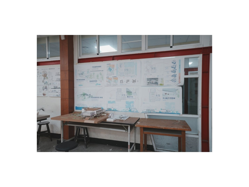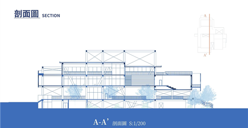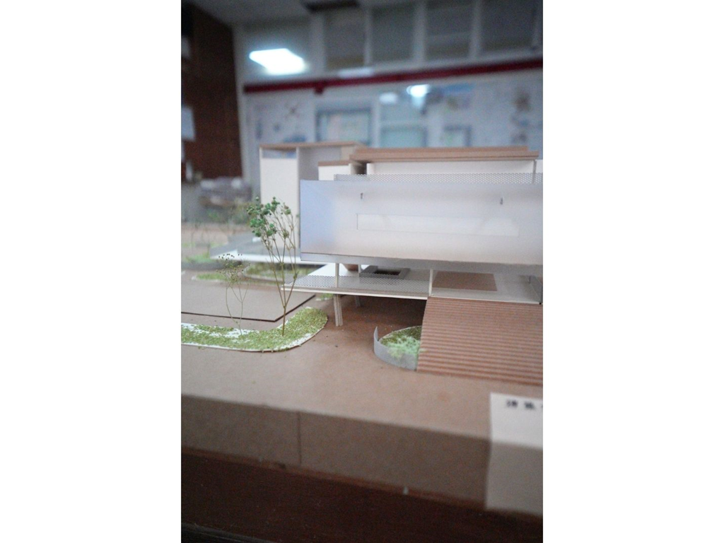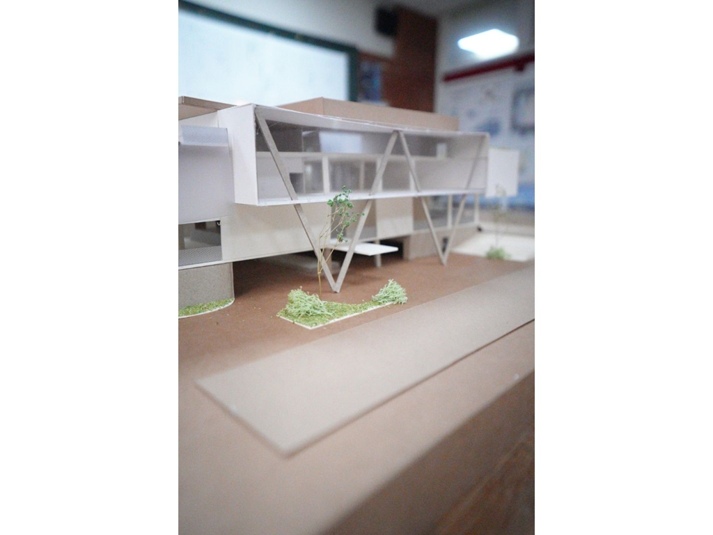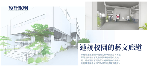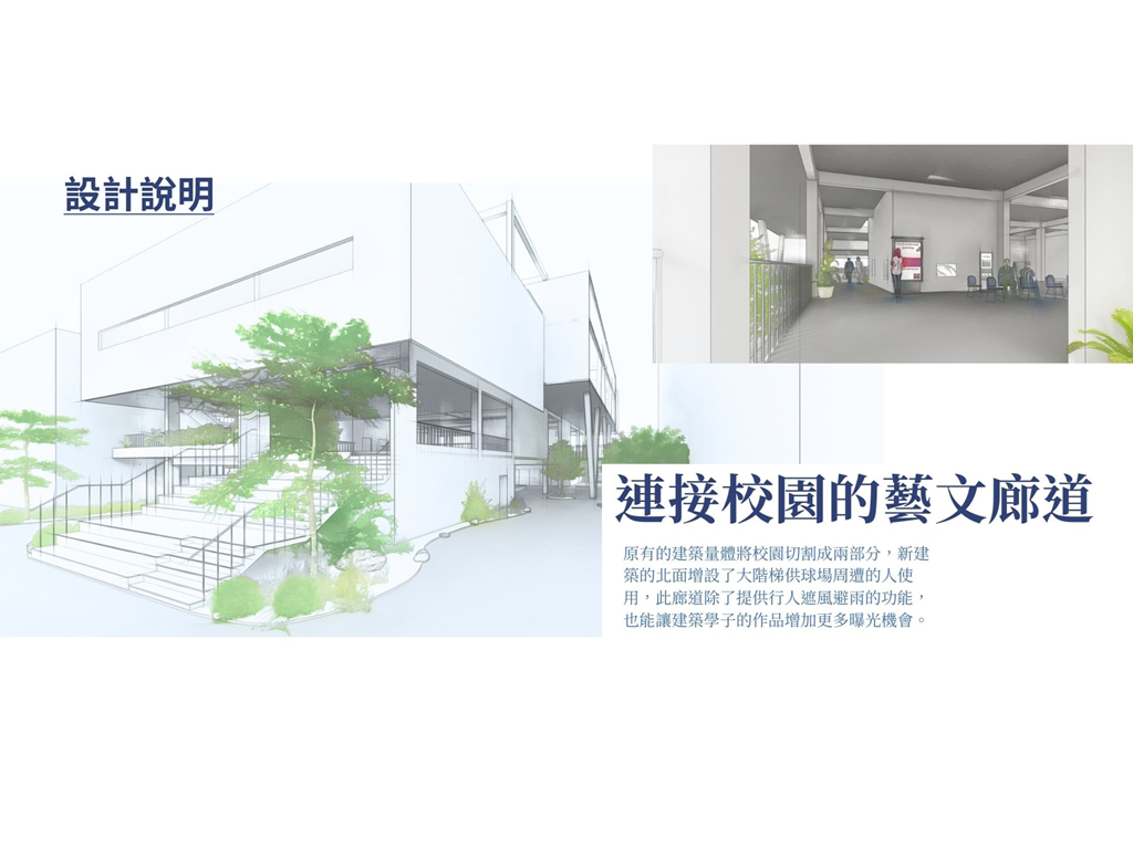 連接校園的藝文廊道:原有的建築量體將校園切割成兩部分,新建築的北面增設了大階梯供球場周遭的人使用,此廊道除了提供行人遮風避雨的功能,也能讓建築學子的作品增加更多曝光機會。
