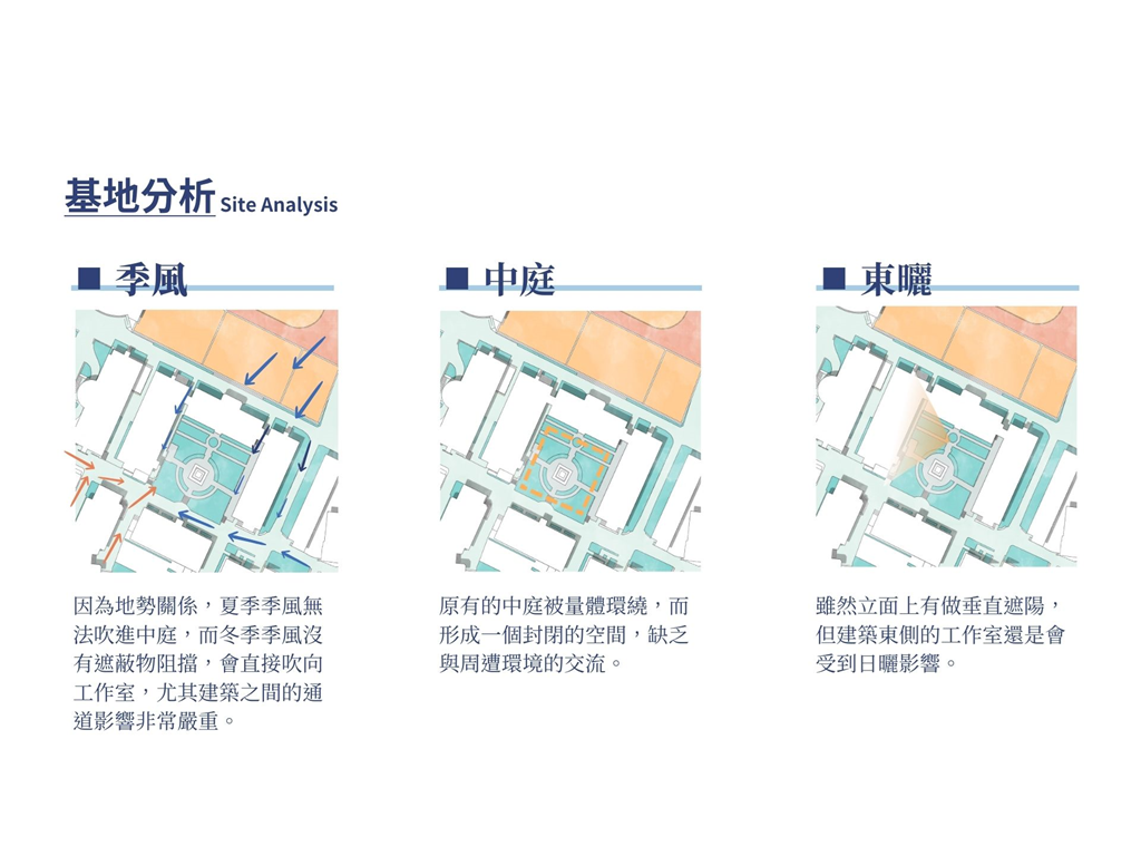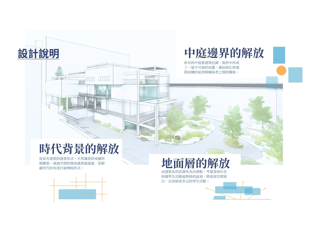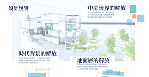時代背景的解放:從原有建築的建築形式,不禁讓我與戒嚴時期聯想。透過空間的開放感與通透感,從解嚴世代的角度打破傳統形式。