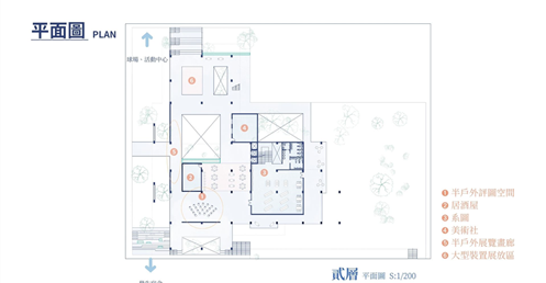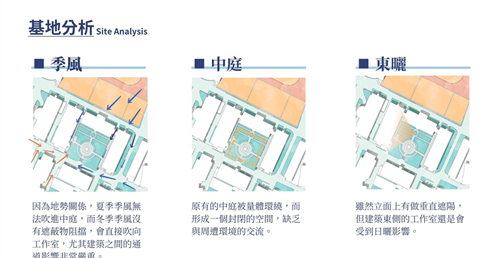 中庭邊界的解放:原有的中庭被建築包圍,無形中形成了一道不可視的高牆,藉由綠化和建築結構的延伸模糊兩者之間的關係。