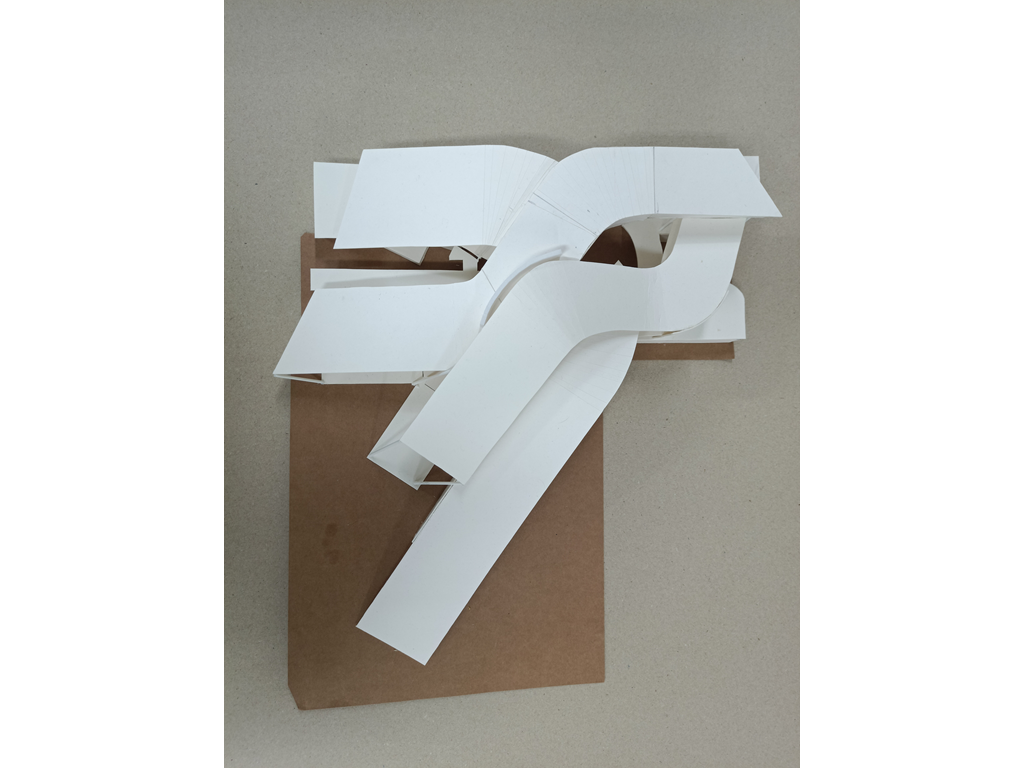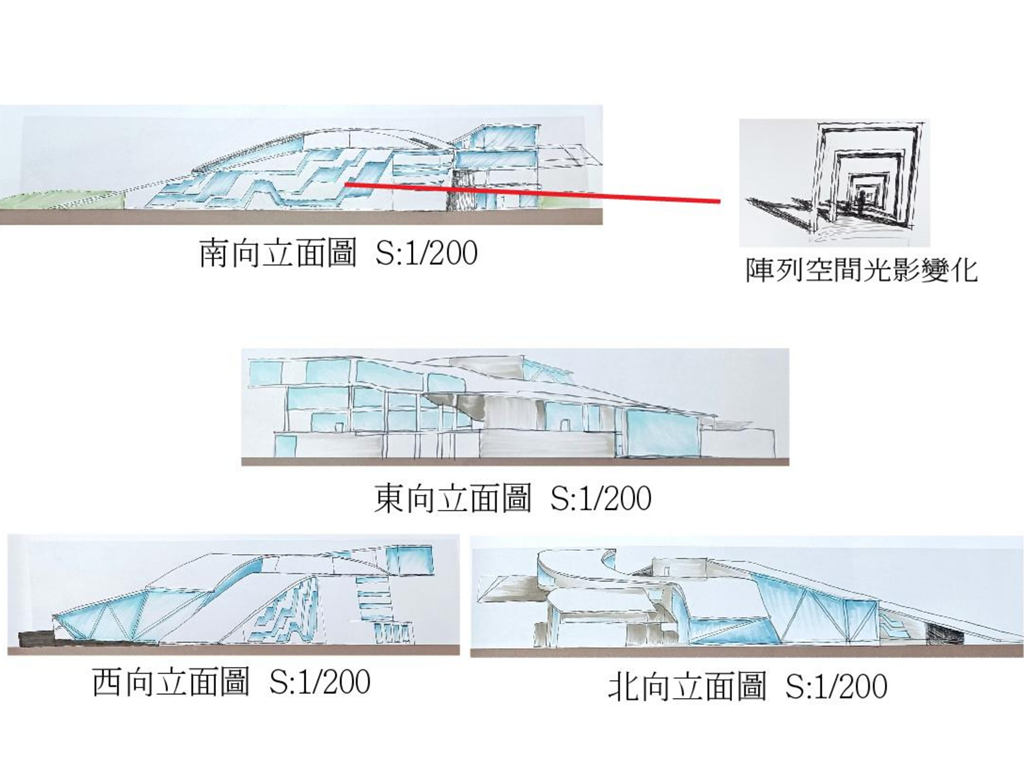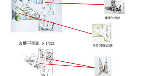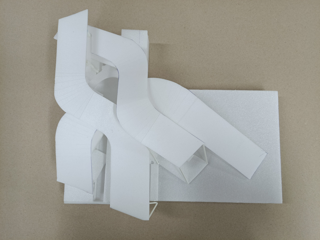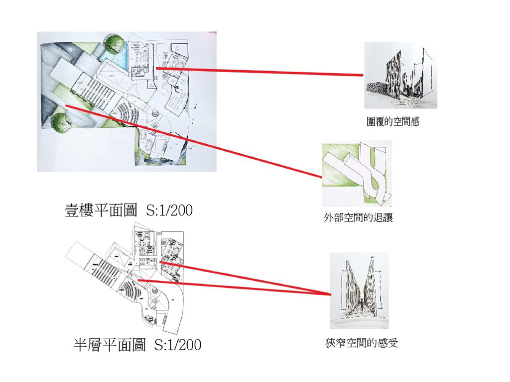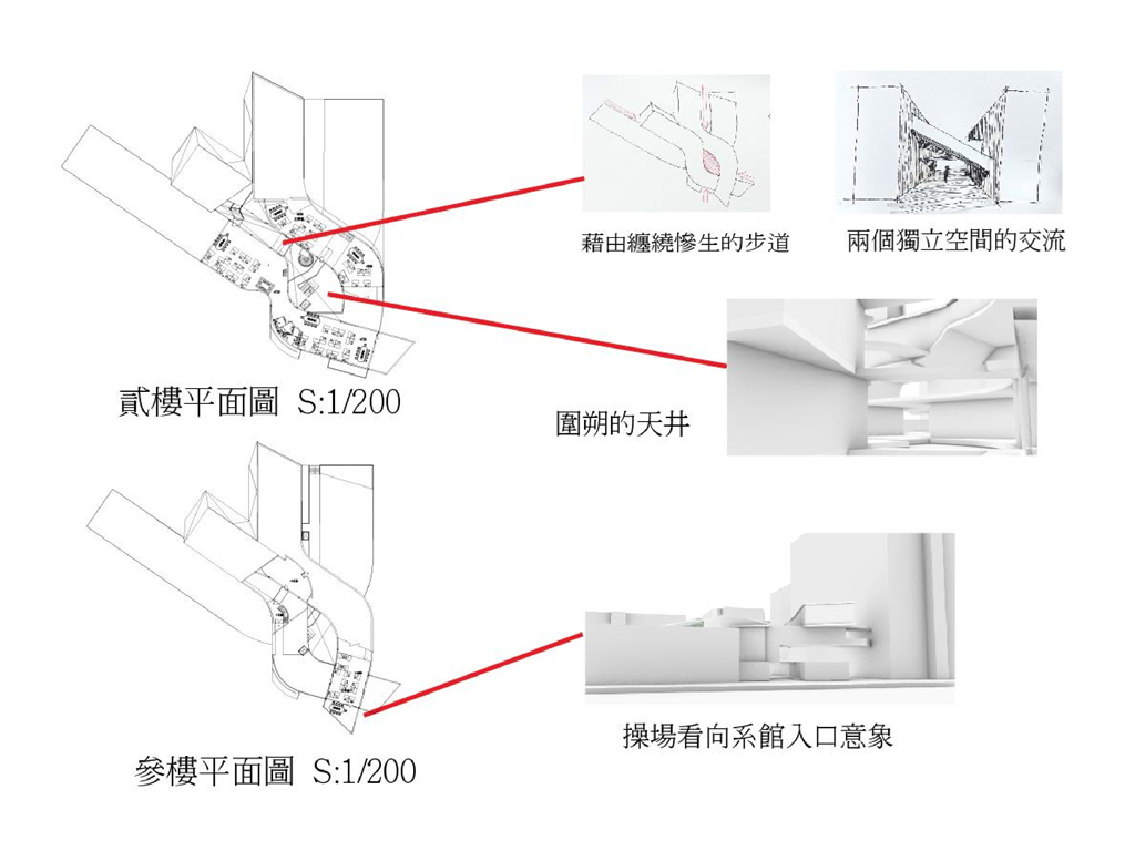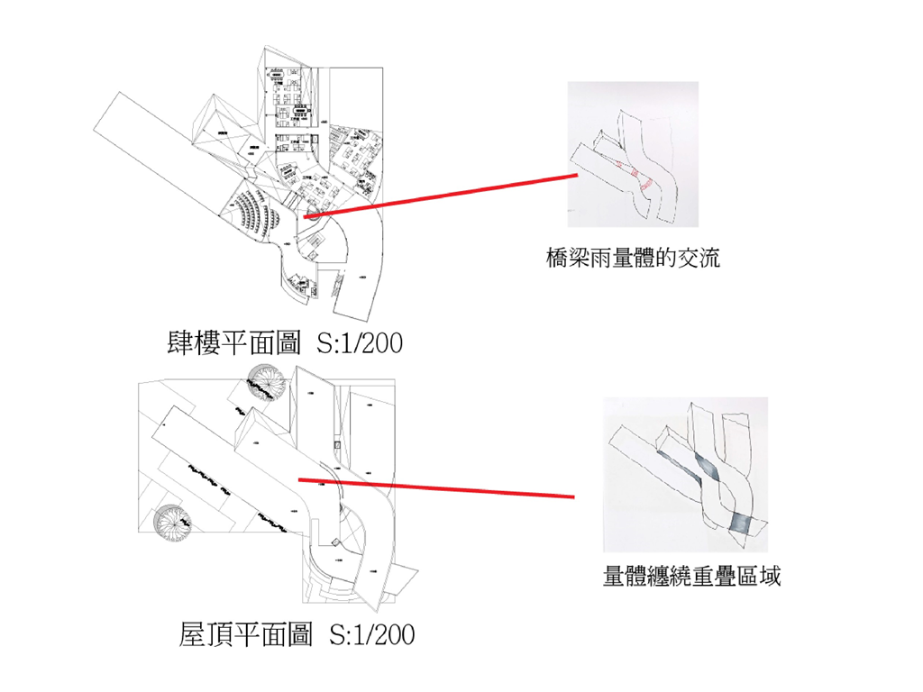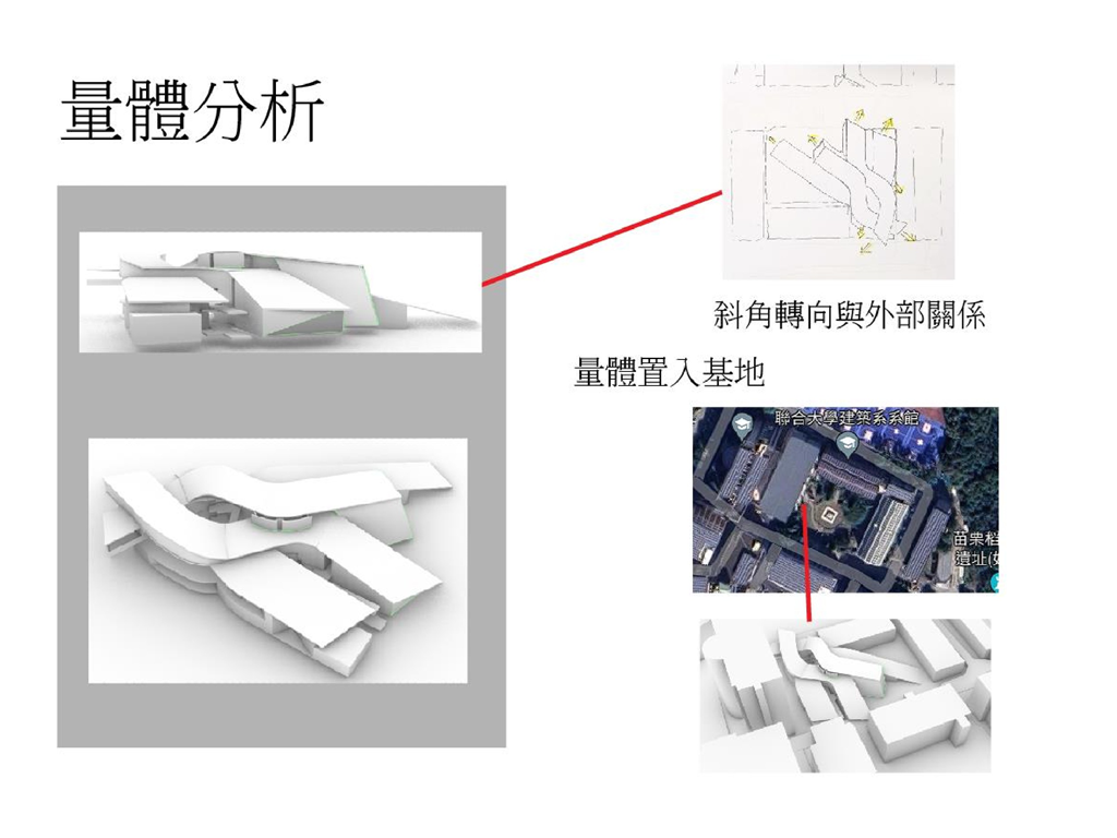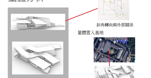 我將分裂的量體運用三條線性整合,一個是U行的線性表達希望人在基地上的環繞或是逗留,再藉由兩條閃電型線性互相攀爬纏繞,表達空間的流動性,在條線性纏繞都過程中,形成了多個虛空間和實空間的事情。