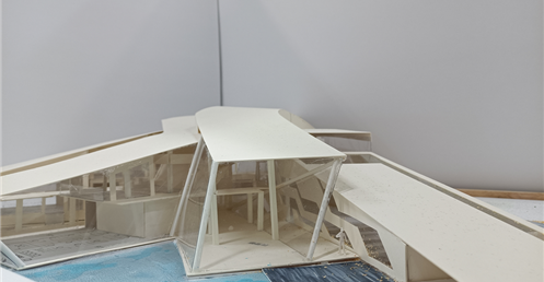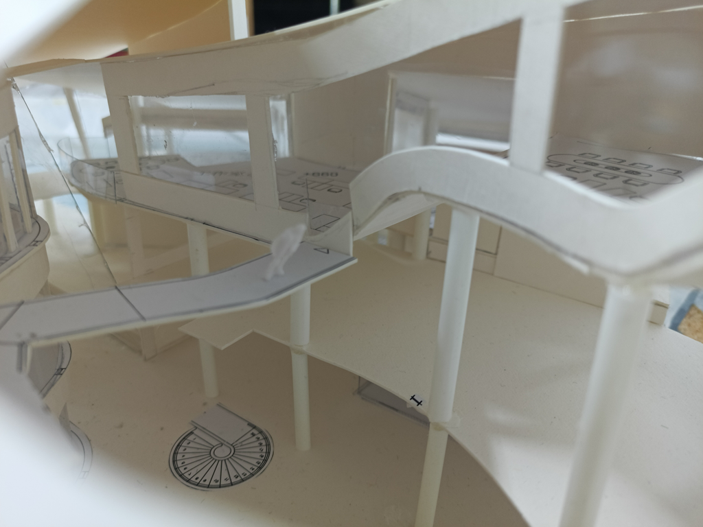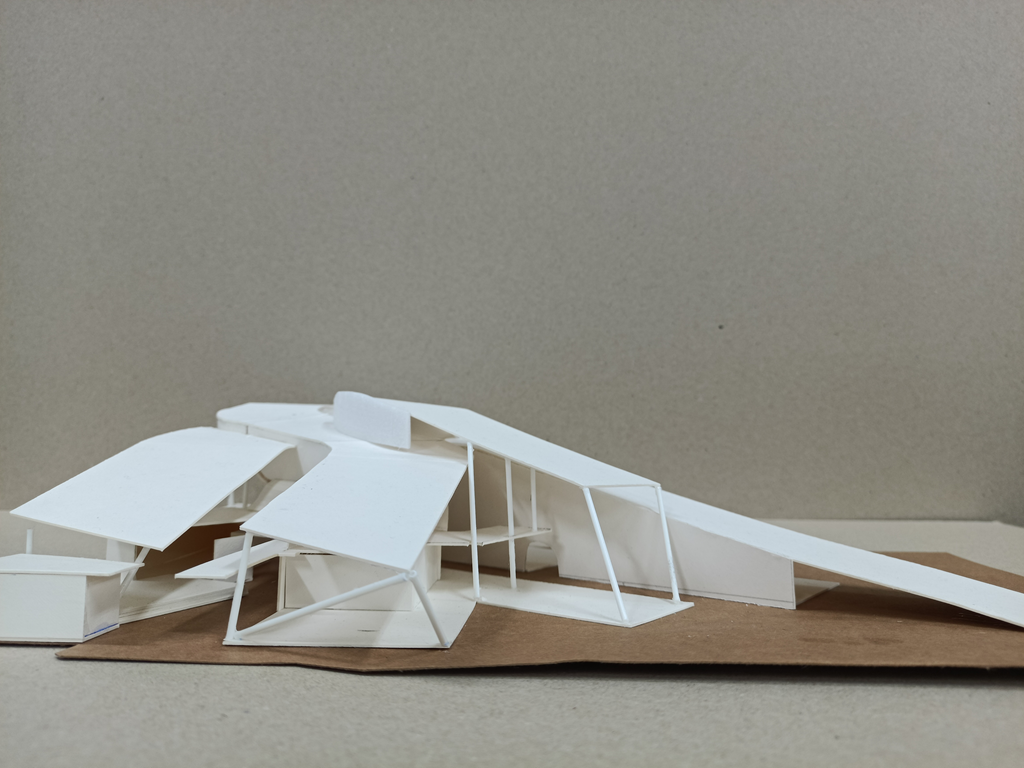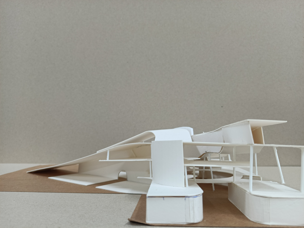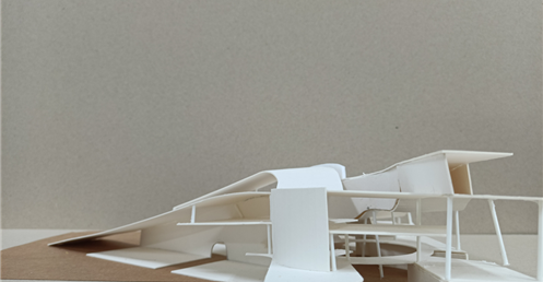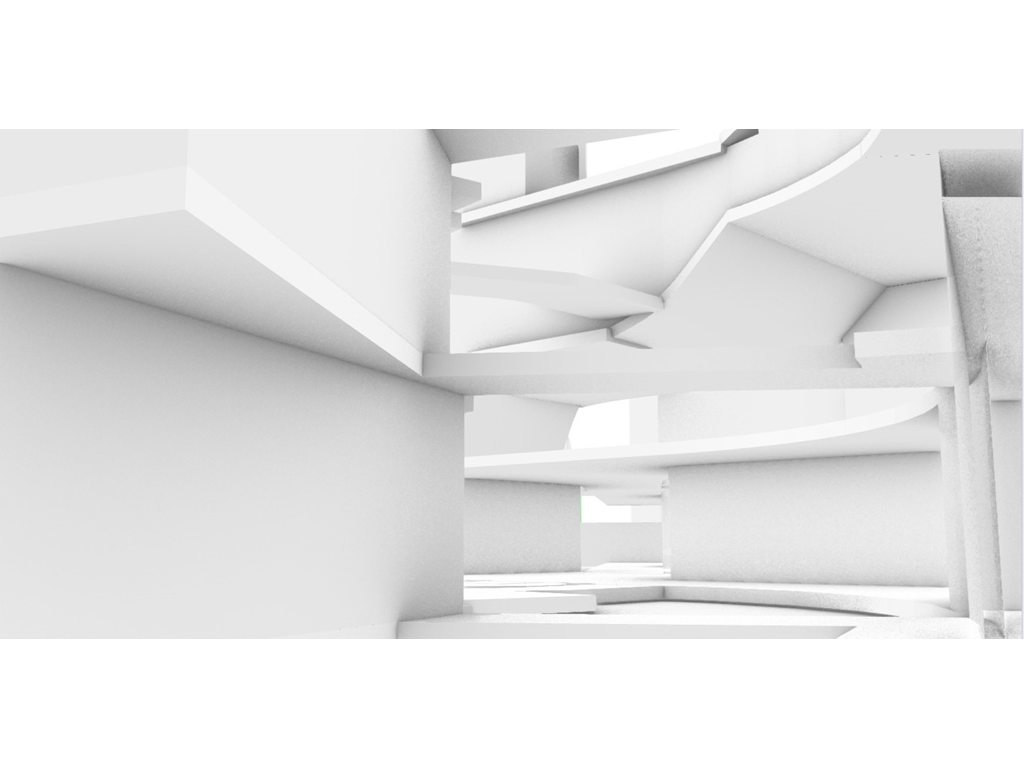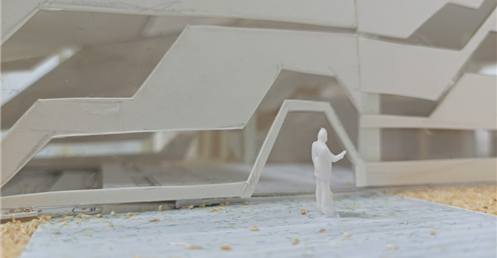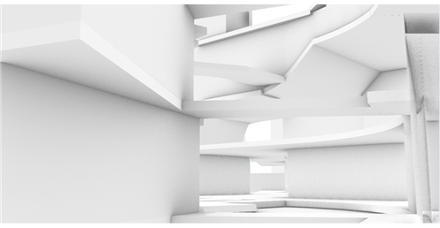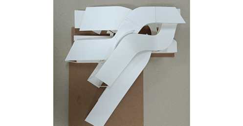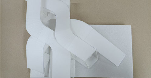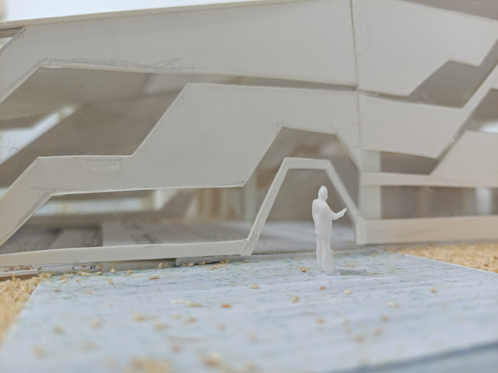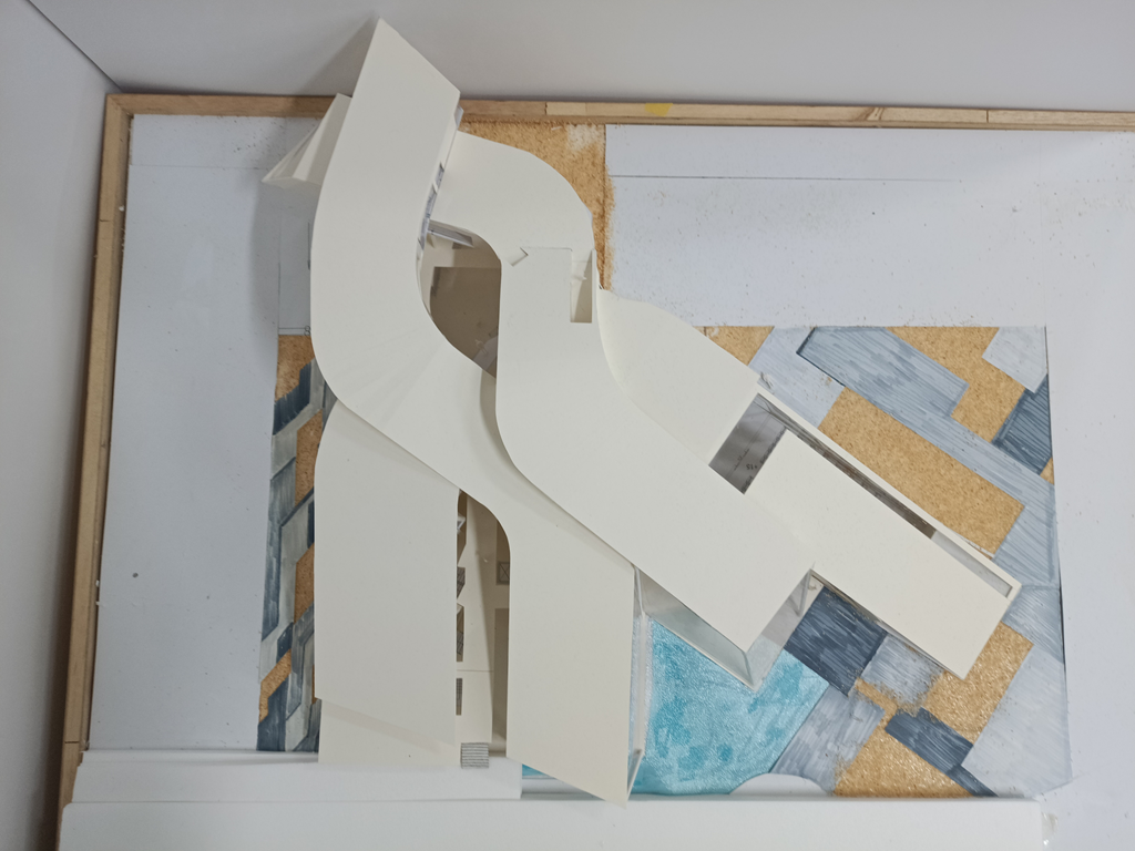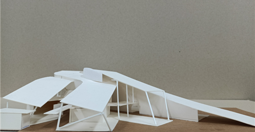 我將分裂的量體運用三條線性整合,一個是U行的線性表達希望人在基地上的環繞或是逗留,再藉由兩條閃電型線性互相攀爬纏繞,表達空間的流動性,在條線性纏繞都過程中,形成了多個虛空間和實空間的事情。