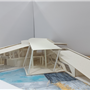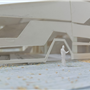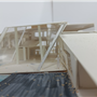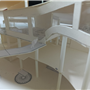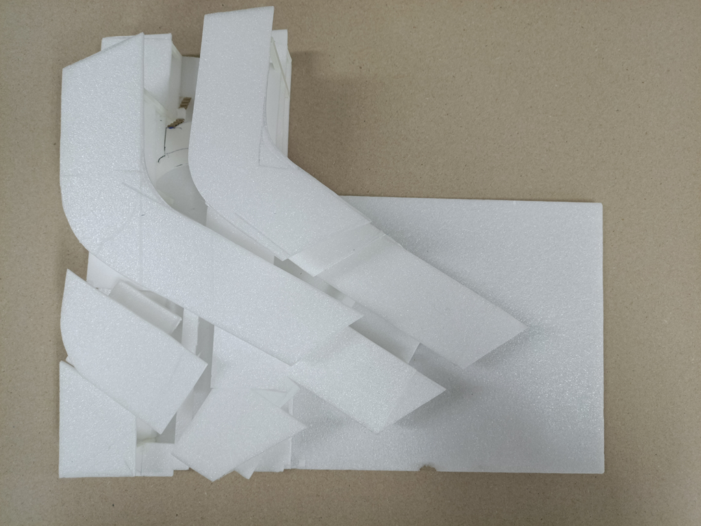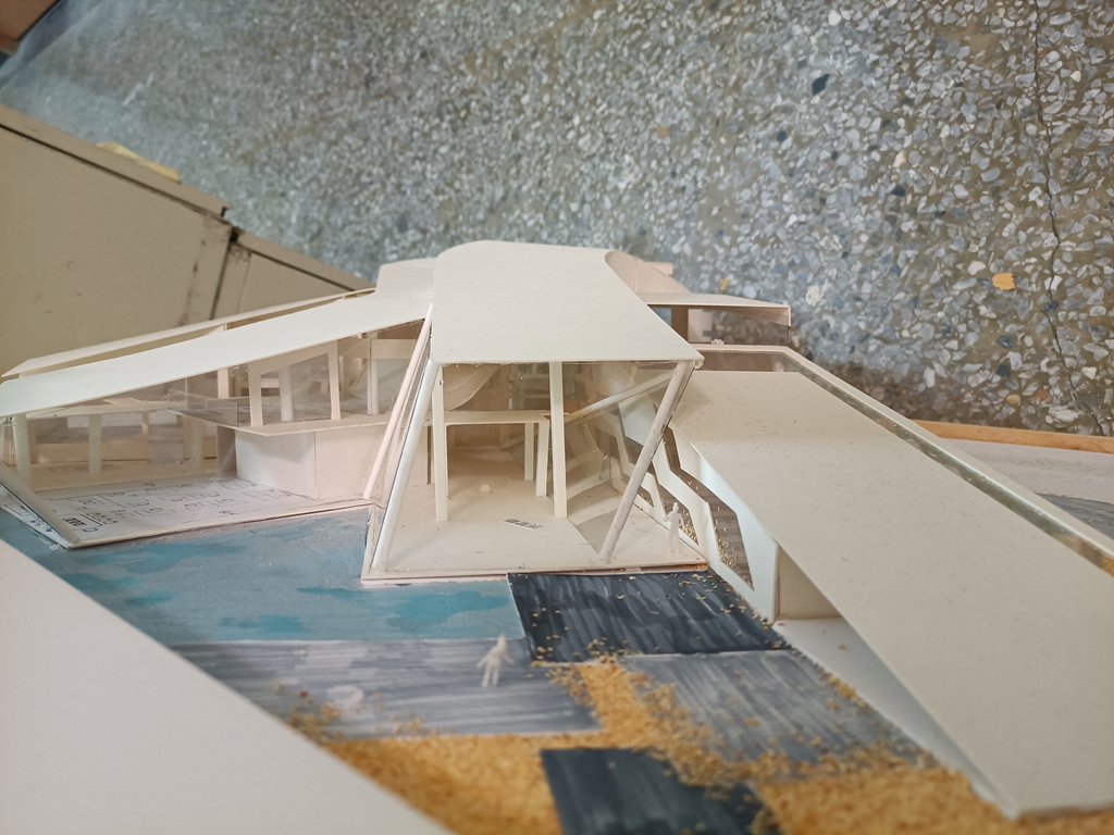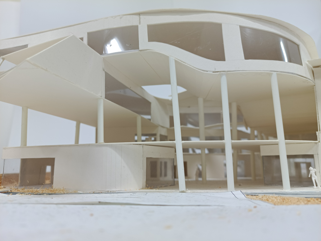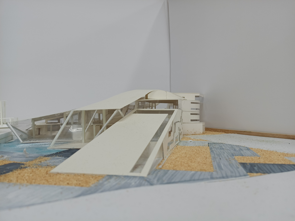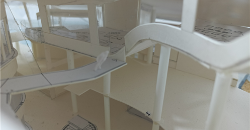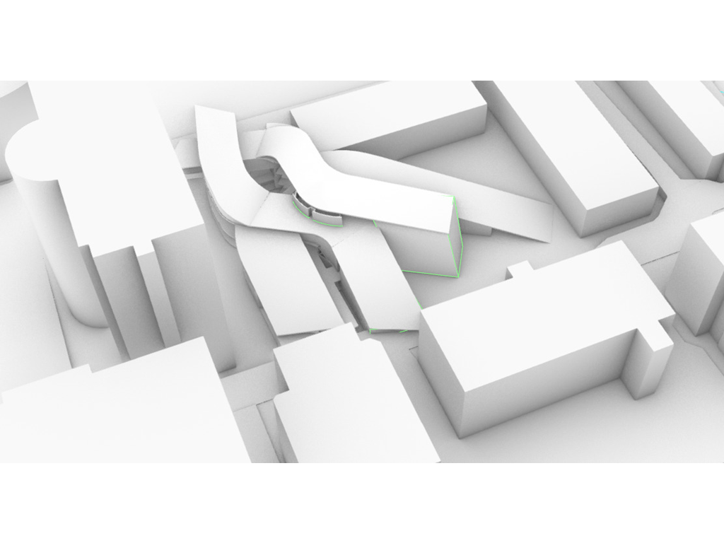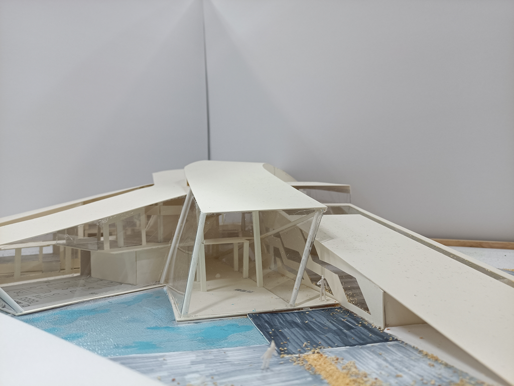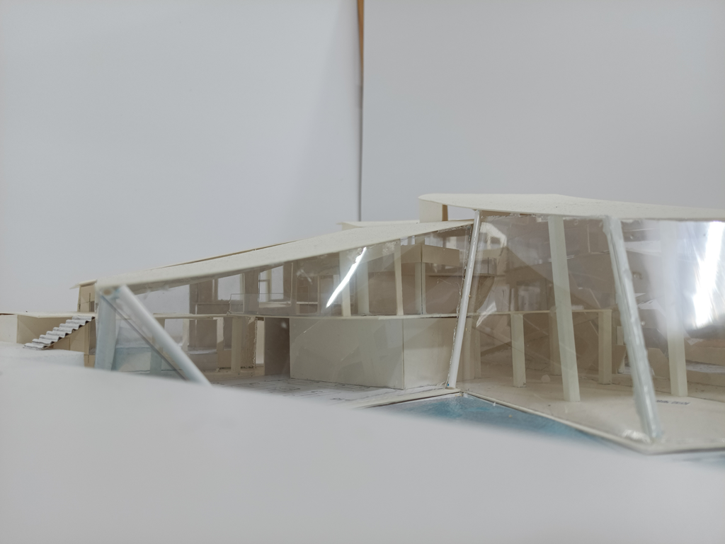 我將分裂的量體運用三條線性整合,一個是U行的線性表達希望人在基地上的環繞或是逗留,再藉由兩條閃電型線性互相攀爬纏繞,表達空間的流動性,在條線性纏繞都過程中,形成了多個虛空間和實空間的事情。