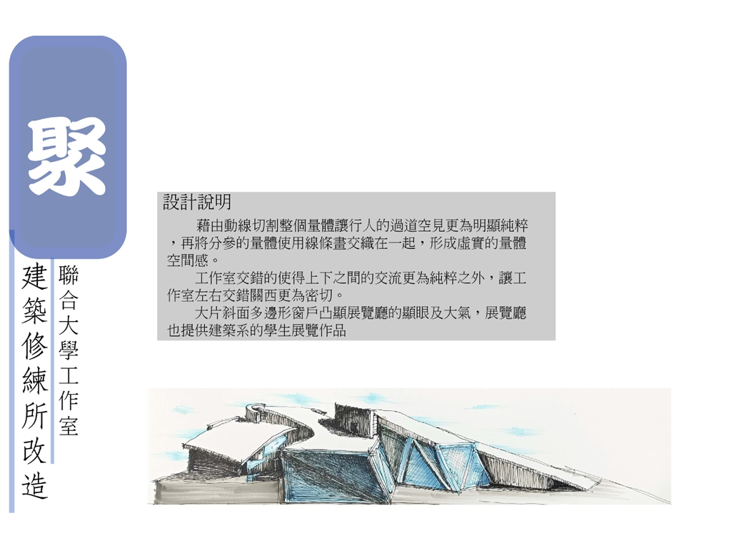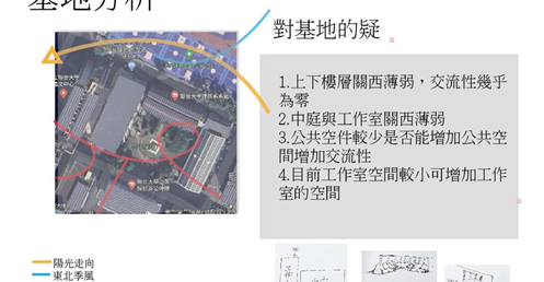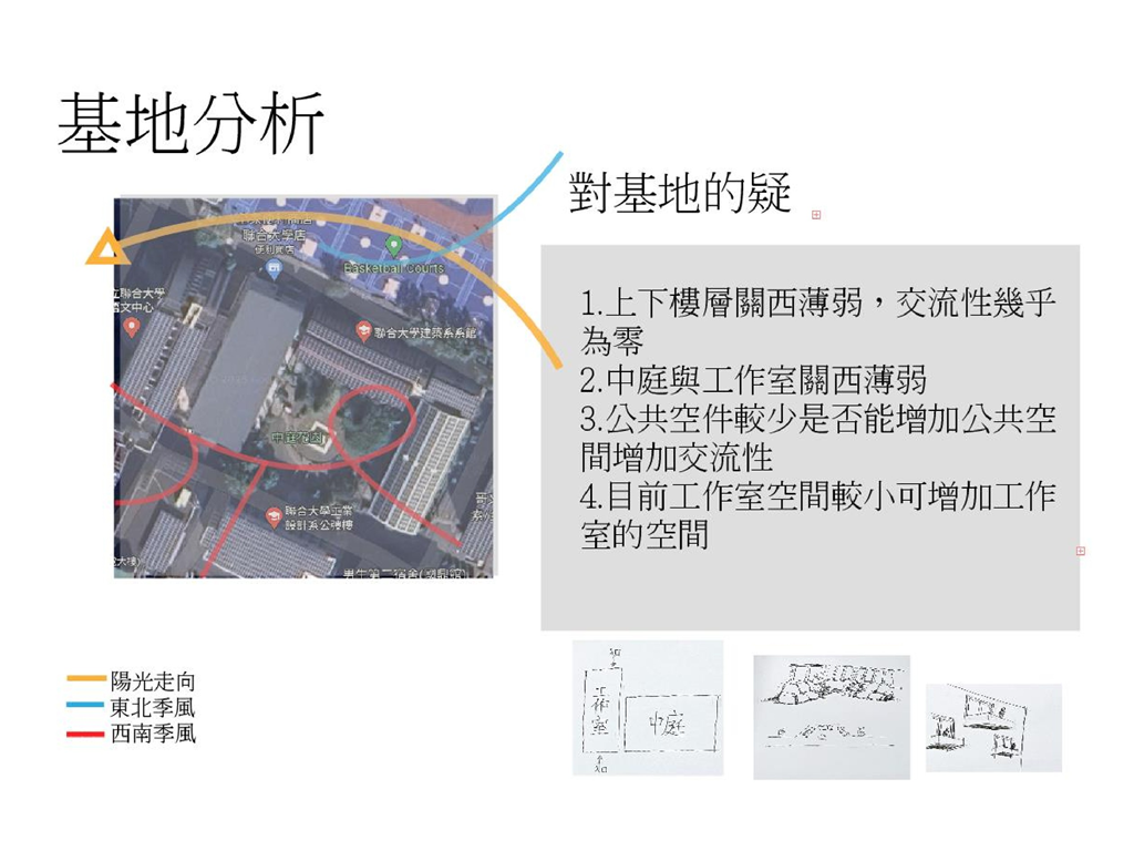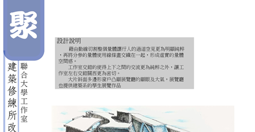 此次案子是聯合大學建築系系館工作室的改建或重建案,要根據我們在建築系生活了兩年半的認知和對空間的不合理性,去做一個改建或是重建。