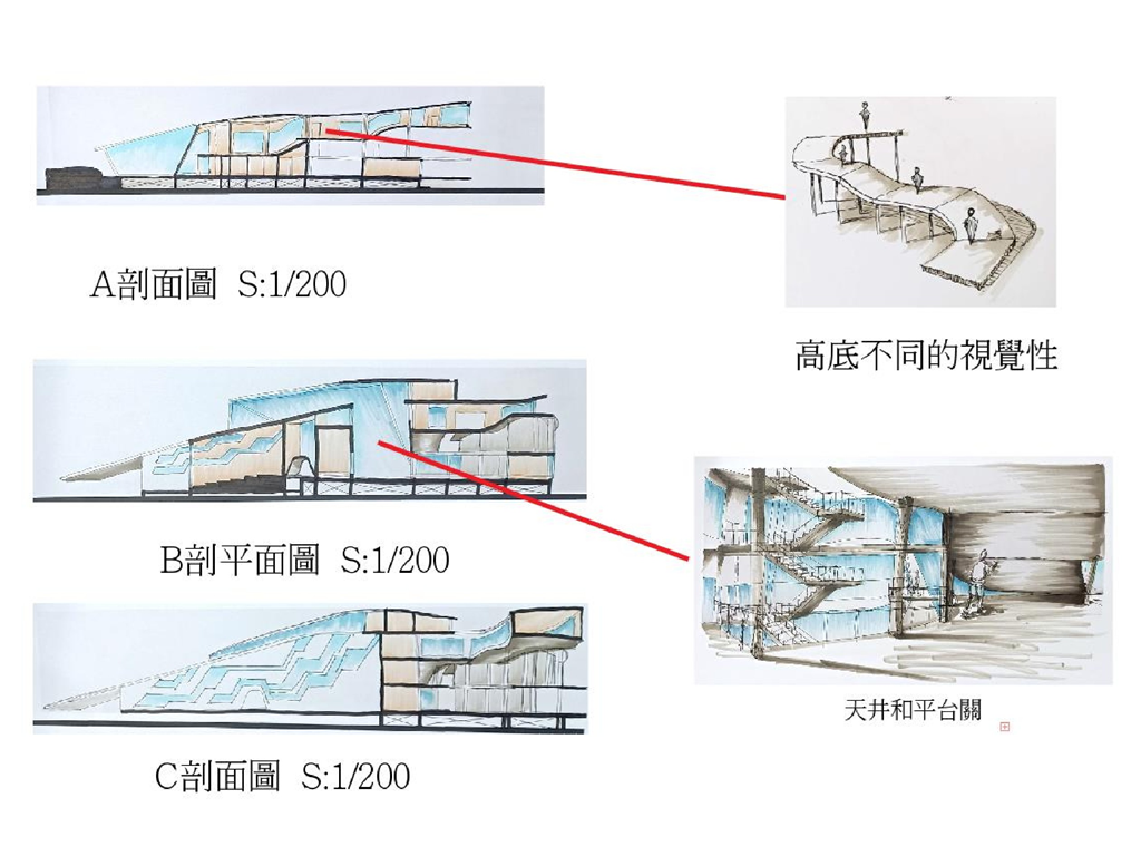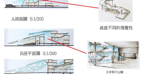 我運用人懶惰的習性,人在選擇動線時會先考慮遠近和是否省力,所以我將學餐到操場這條有240高差的路上做了樓梯一個只需七階就能到二樓,另一個要十幾階才能到一樓,此時每個人都會選擇七階的樓梯穿越系館,也因此將一樓空間形成一個半公共的地方。