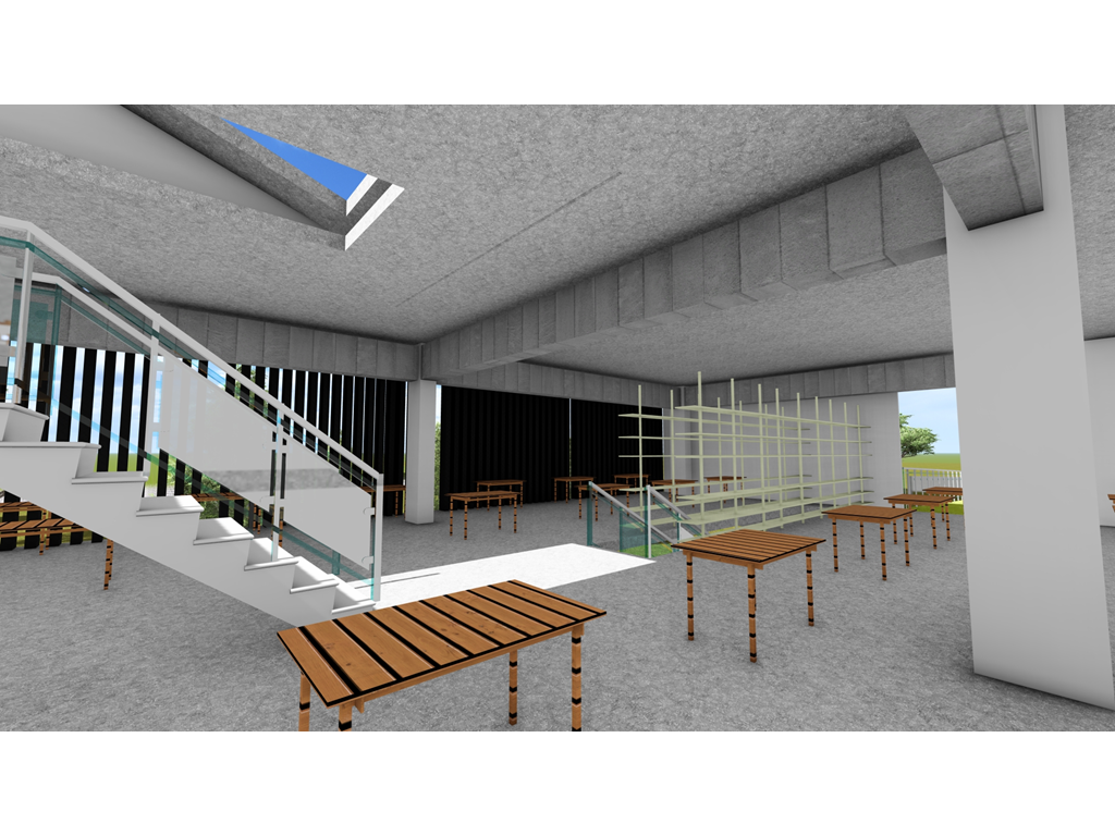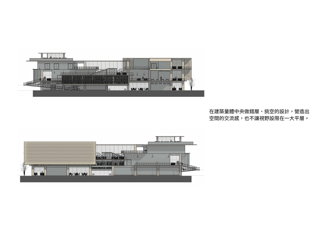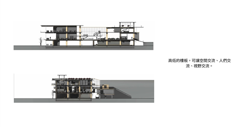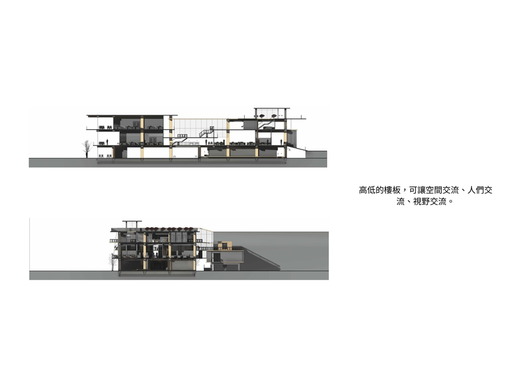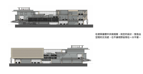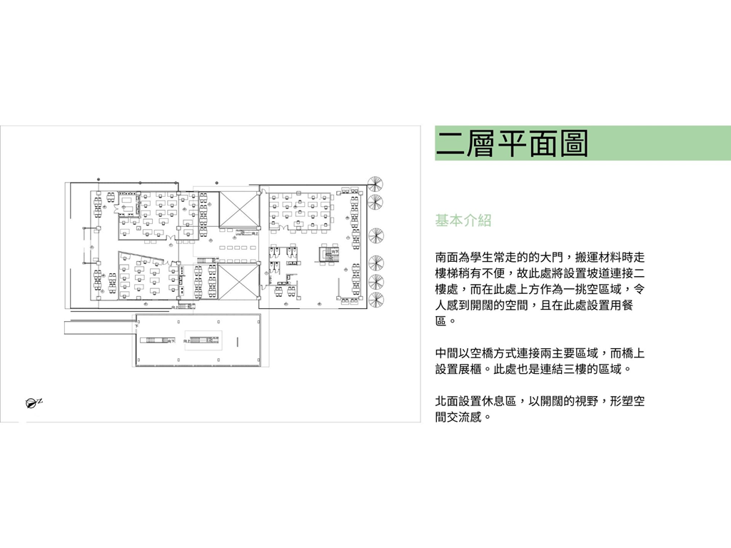 由於南面是學生常走的大門,為了方便搬運材料,特別設置坡道連接二樓。上方的挑空區域則為學生提供了一個寬敞的用餐區域,使得這裡不僅僅是通行的地方,更是一個社交和放鬆的場所。