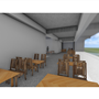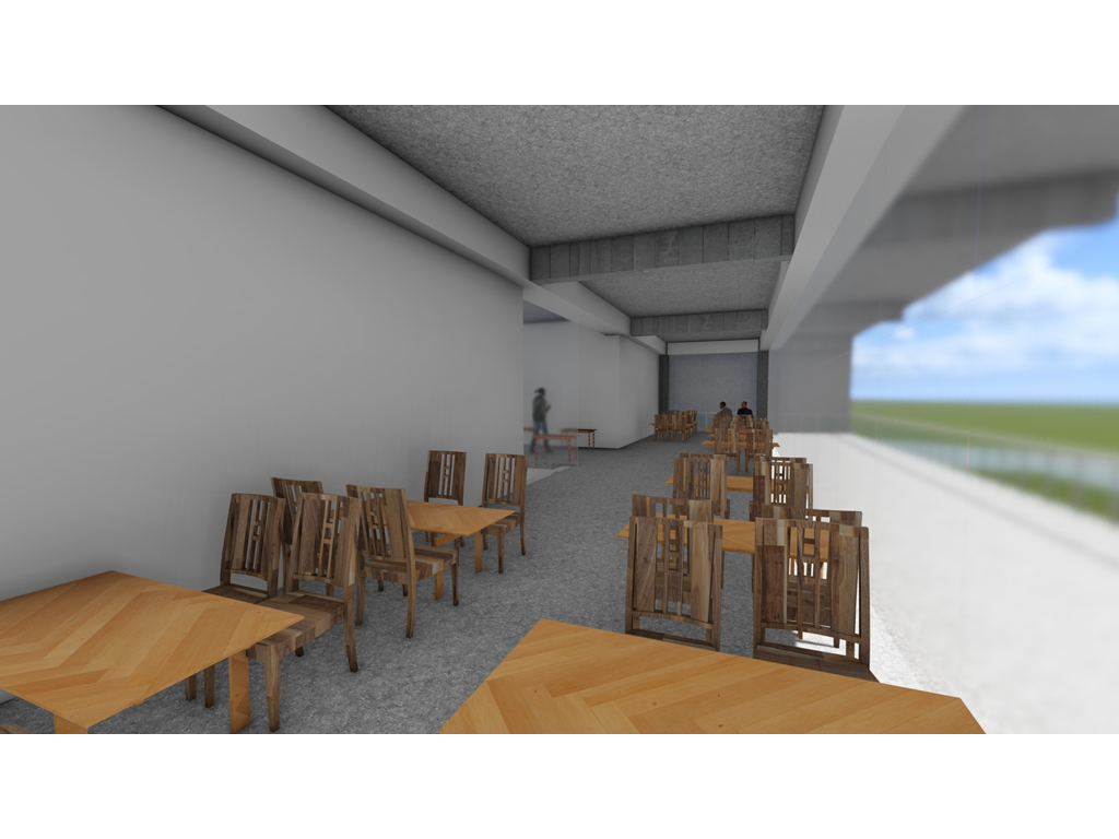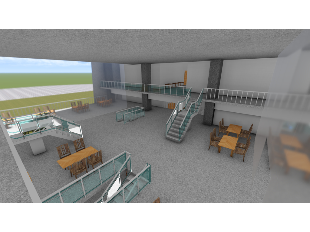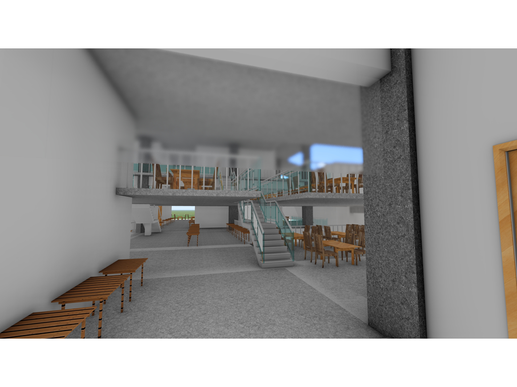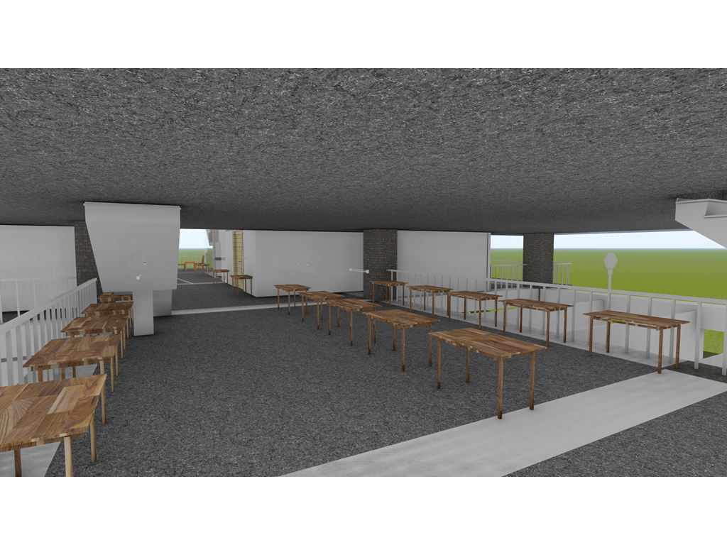 由於南面是學生常走的大門,為了方便搬運材料,特別設置坡道連接二樓。上方的挑空區域則為學生提供了一個寬敞的用餐區域,使得這裡不僅僅是通行的地方,更是一個社交和放鬆的場所。
