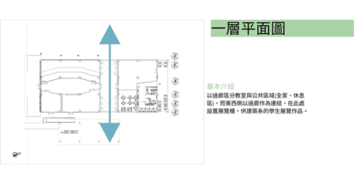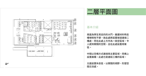 我將教室、公共區域、展覽空間和休憩環境融合在一起,形成一個多功能且開放的學習社區。以下是對於每個區域的一些想法:
