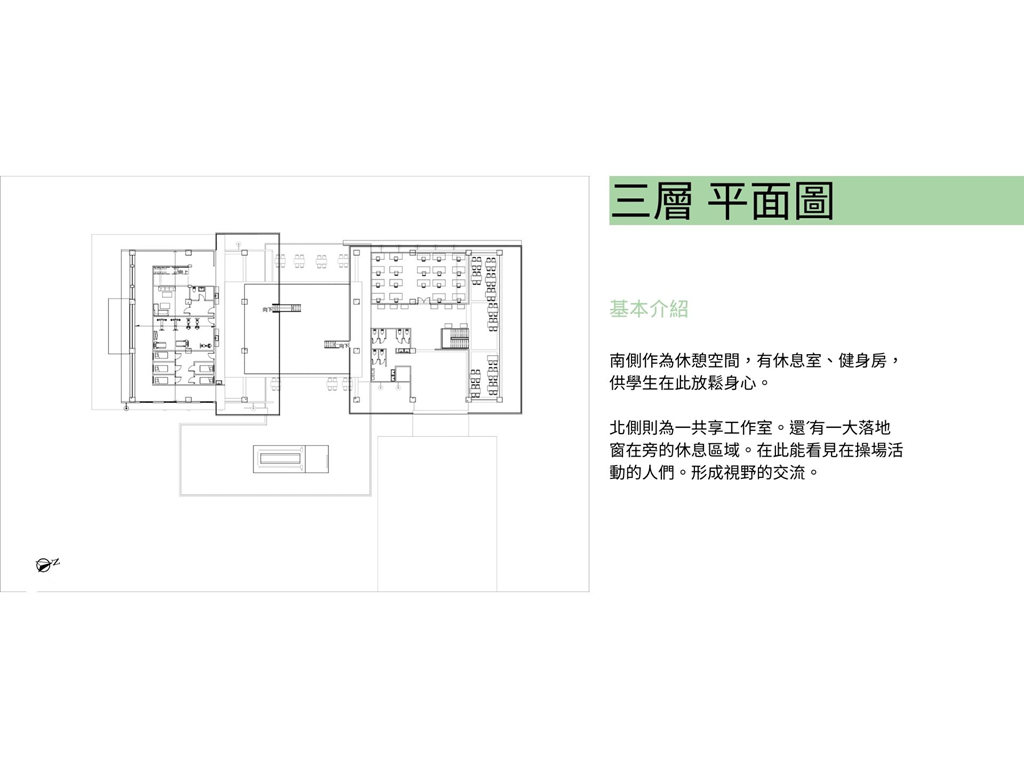 南側的休憩區域更加豐富多樣,有休息室、健身房,並提供一個共享的工作室。這樣的設計有助於學生在休息的同時保持活力,並提供一個創意和共同合作的空間。