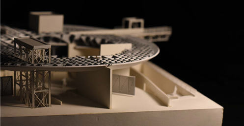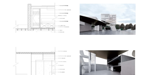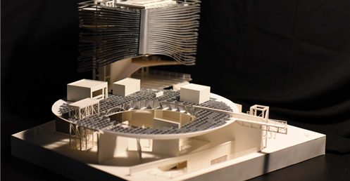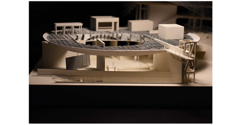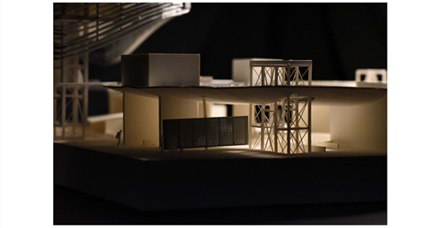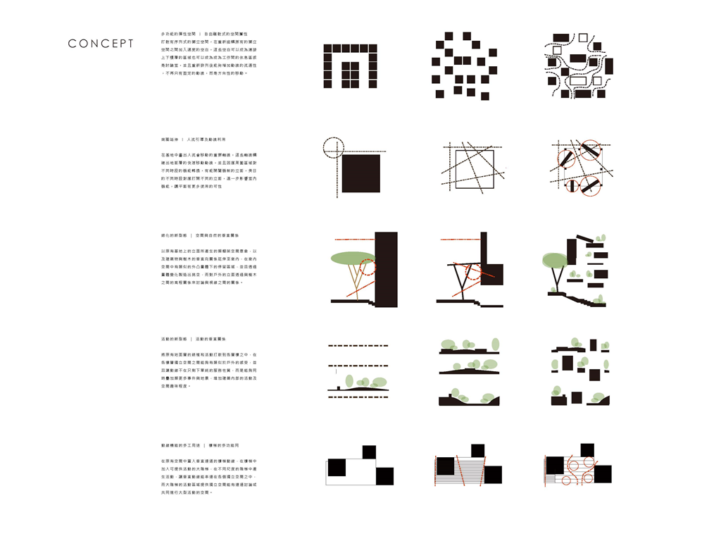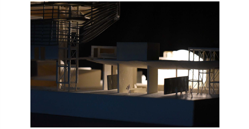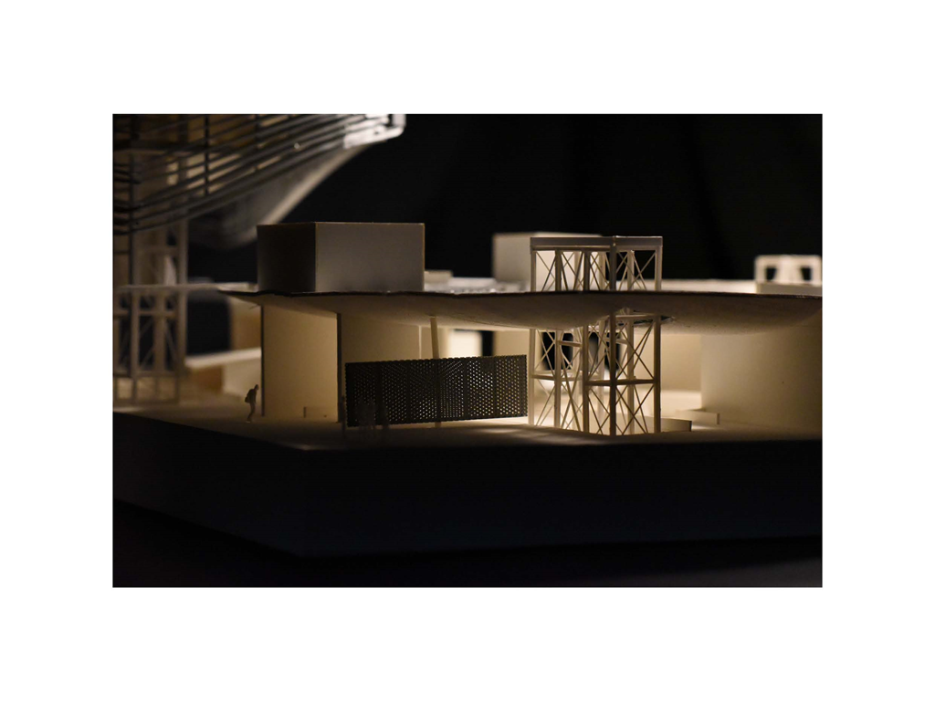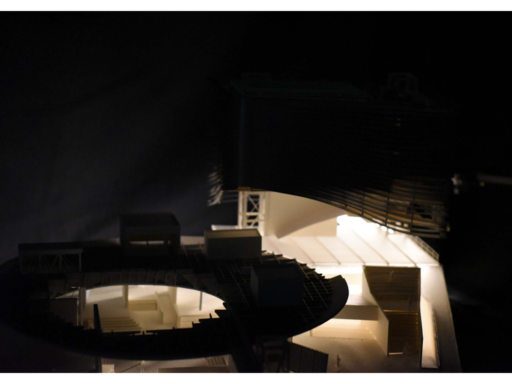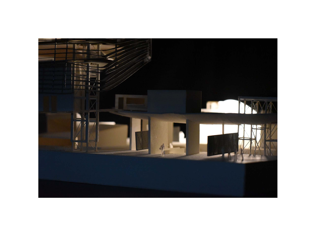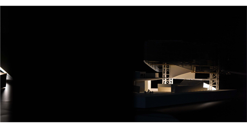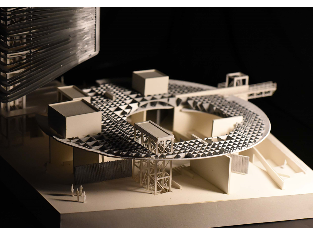 在建築的量體上以巨大的內縮圓盤將人們導入地面的廣場及校園,且圓盤同時串連著校內及校外的小型廣場,並將育成中心及工作室空間收集成方盒至於基地的東北角,藉此拉開與其他建物的間距,量體上降低的圓盤量體,讓光線在立面上的變化也能快速的將資訊反映在大眾的眼球下,借此加強資訊變遷的可閱讀性,讓光不僅是具象的活動關係,而是能被富含著環境變化下的資訊。