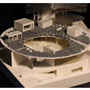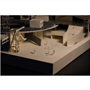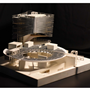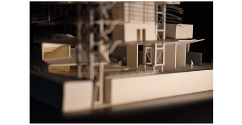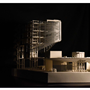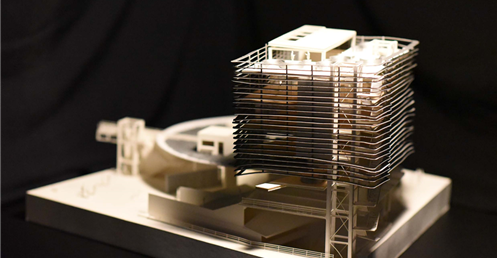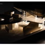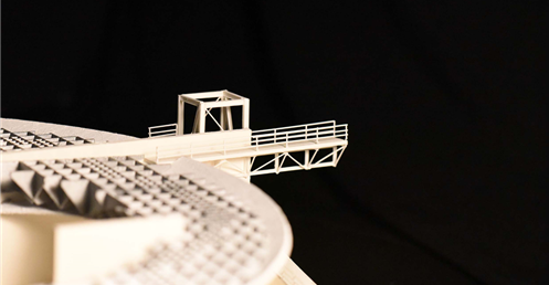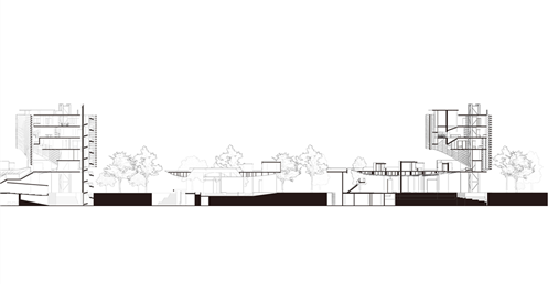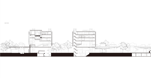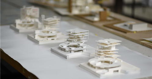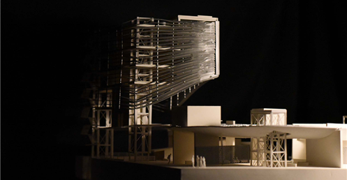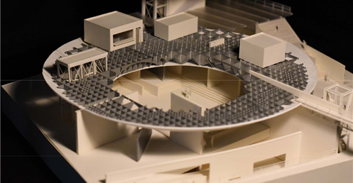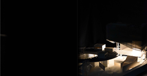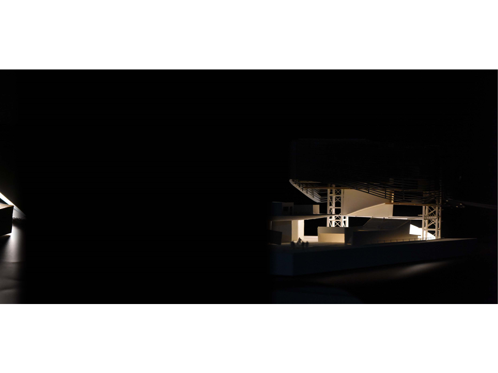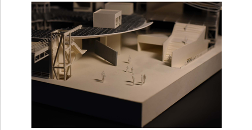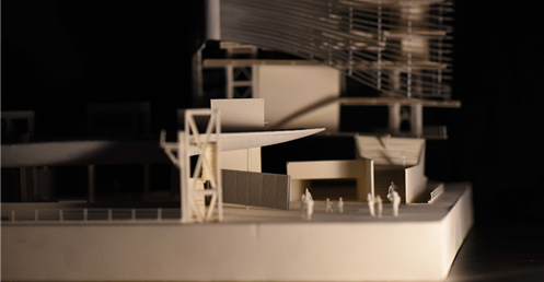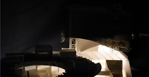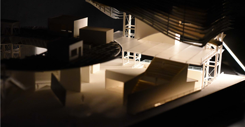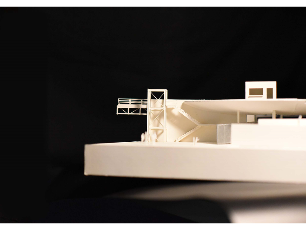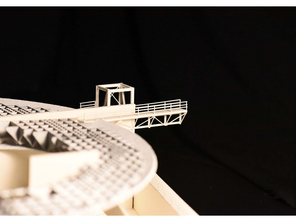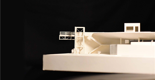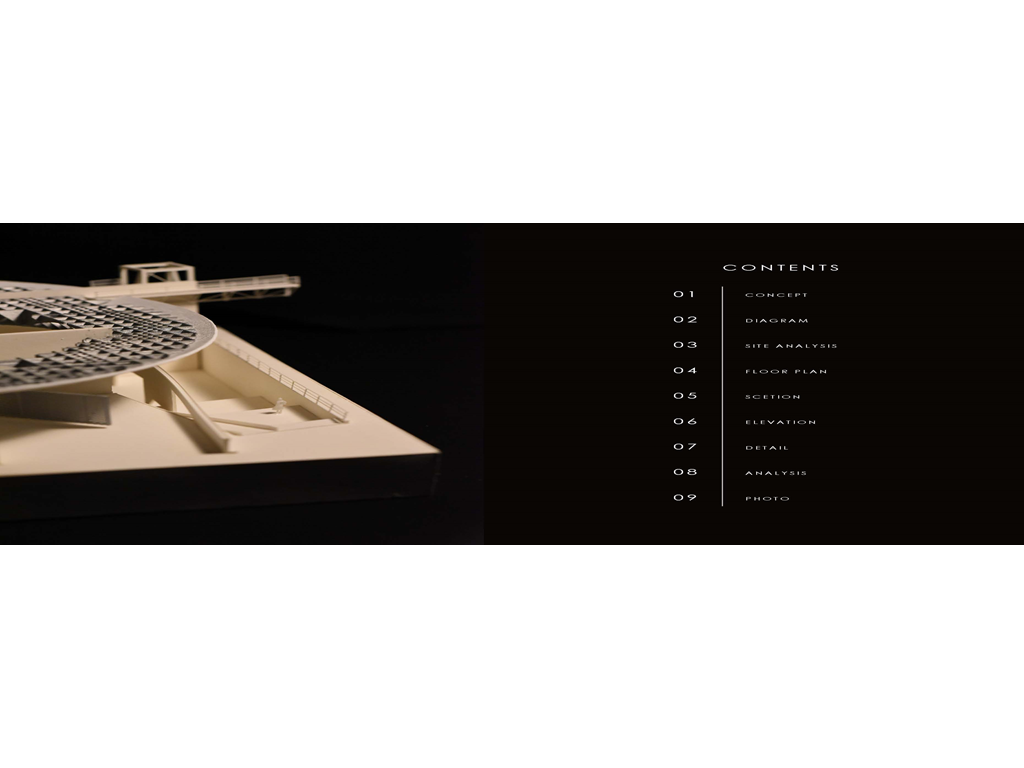 在建築的量體上以巨大的內縮圓盤將人們導入地面的廣場及校園,且圓盤同時串連著校內及校外的小型廣場,並將育成中心及工作室空間收集成方盒至於基地的東北角,藉此拉開與其他建物的間距,量體上降低的圓盤量體,讓光線在立面上的變化也能快速的將資訊反映在大眾的眼球下,借此加強資訊變遷的可閱讀性,讓光不僅是具象的活動關係,而是能被富含著環境變化下的資訊。