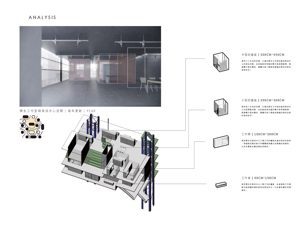 城市的高速發展導致建築內部機能不斷的變遷且越加複雜,如何面對發展下所帶來的變動性及多元性,成為本次設計的挑戰。透過研究目前光華館內部及周遭的機能變化及現況,找出其變動的時間規律,並提出模矩化的設計,並且設置可變動的模矩單元,讓空間保留適度的彈性,且因應周遭環境的人流及建物。