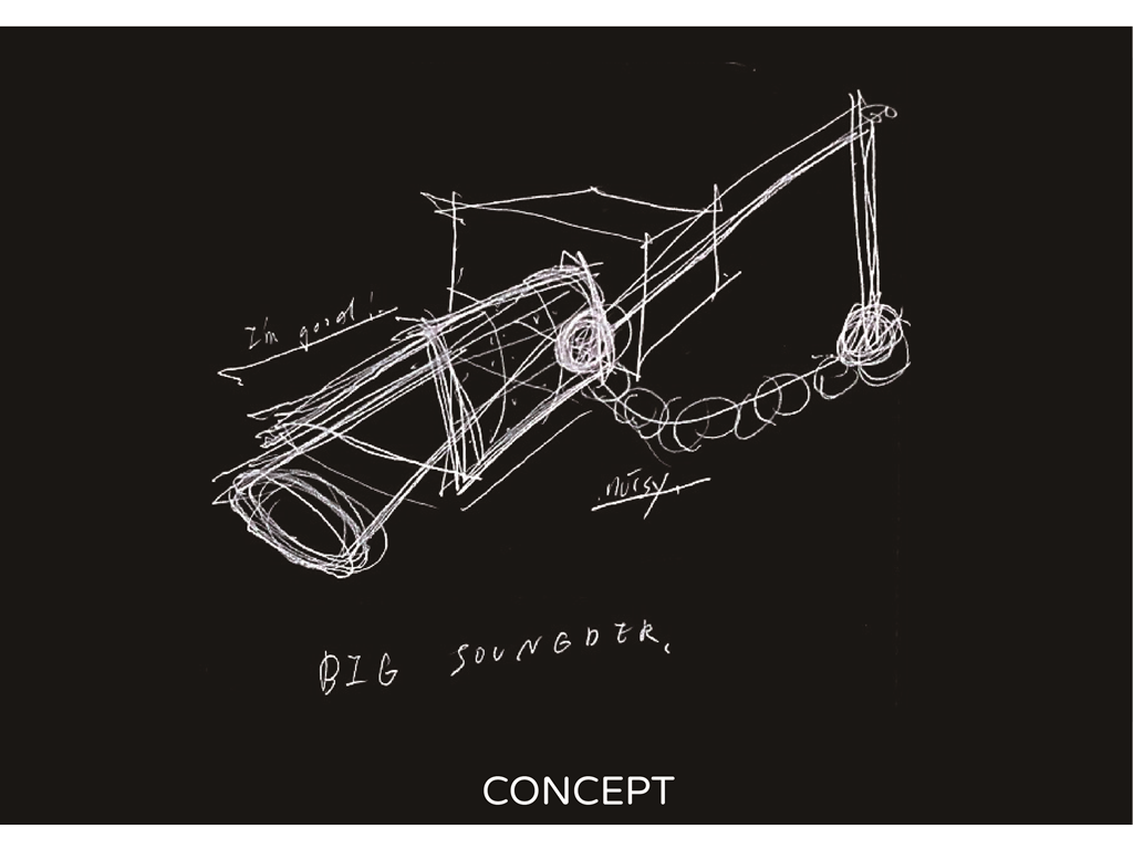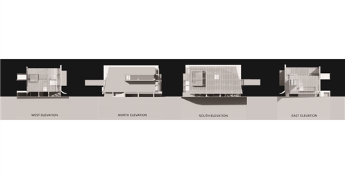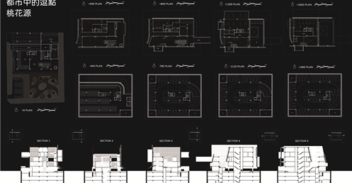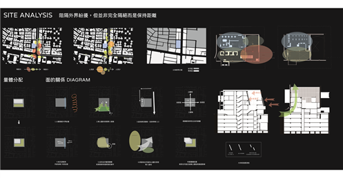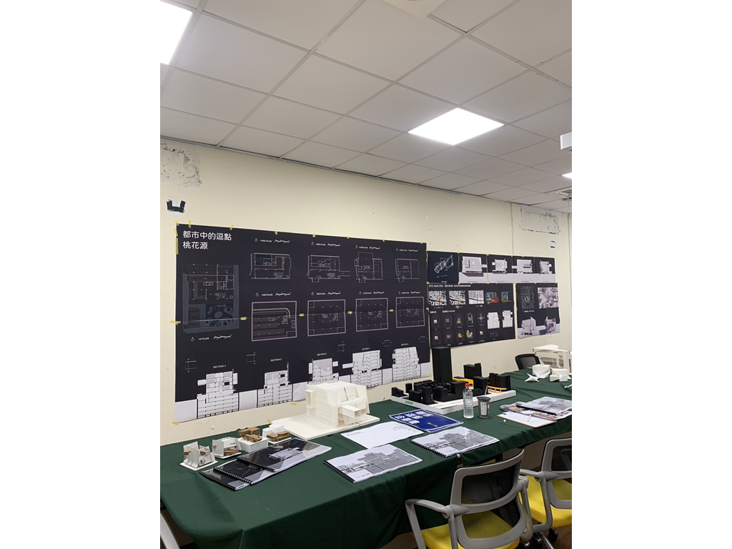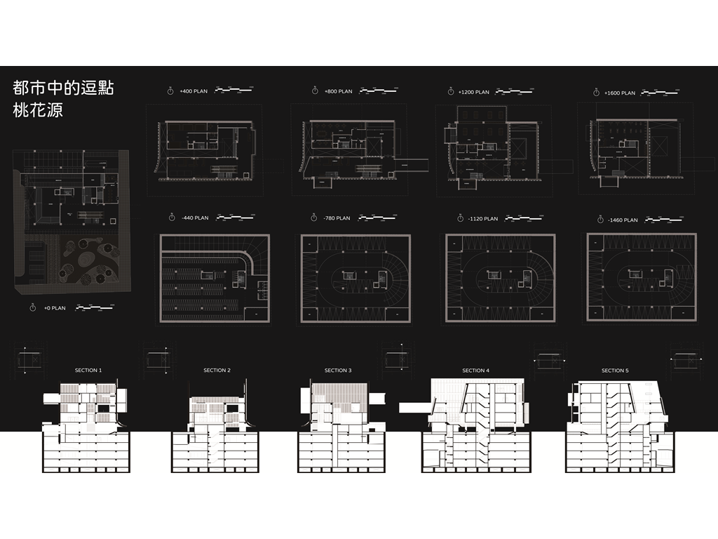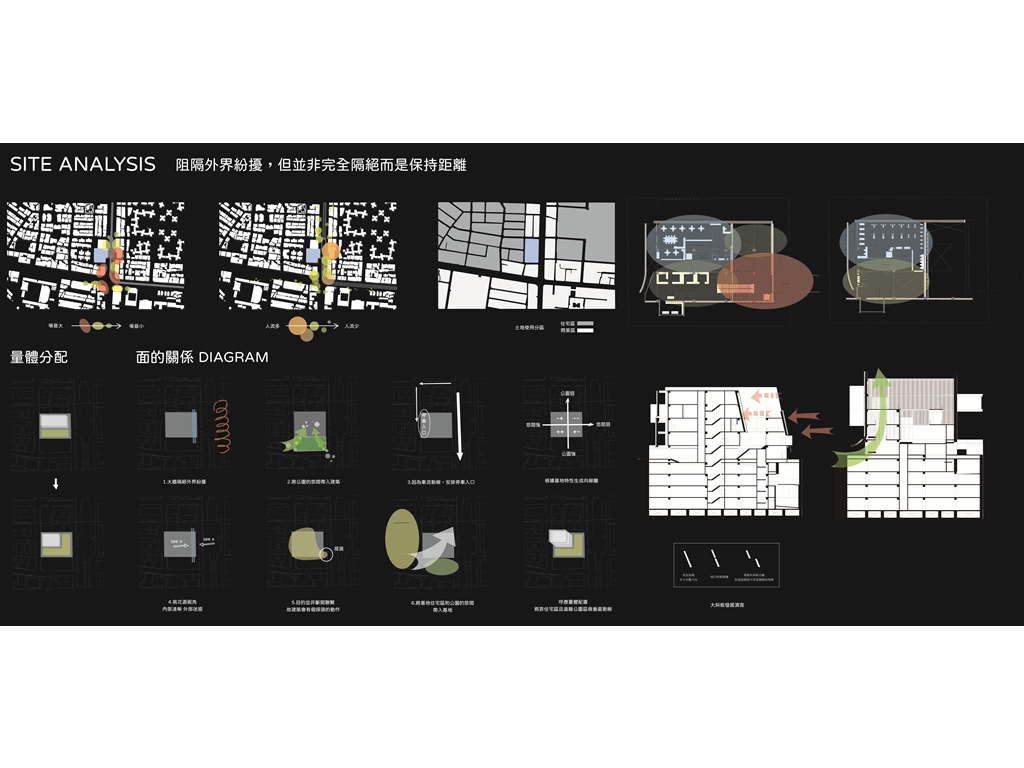 桃花源的故事講述的是人們在意料之外發現一個不顯眼的入口,因而發現充滿祥和和悠閒的桃花源。本設計將四面圍起來,透過不同"面"的表現關係,呼應對基地的觀察:捷運站旁總是充滿著人和紛擾,而公園和後方住宅區的悠閒卻沒有被發現實在可惜,於是先是以"阻隔但不完全隔絕,而是保持點距離"的策略面對外界的紛擾,於是在面對捷運站以及大馬路的入口以一片版一分為二並前後隔開的方式表現概念,同時在側邊留下適合“探頭”的洞口(配置電梯),希望隔開的動作不呆板。