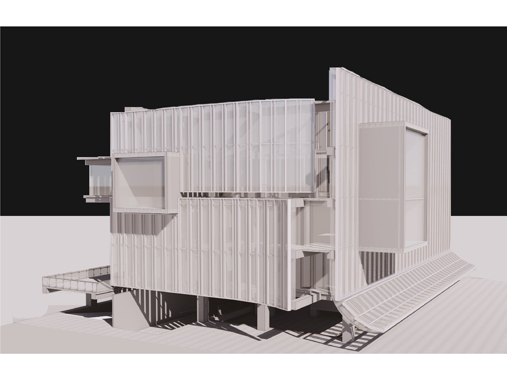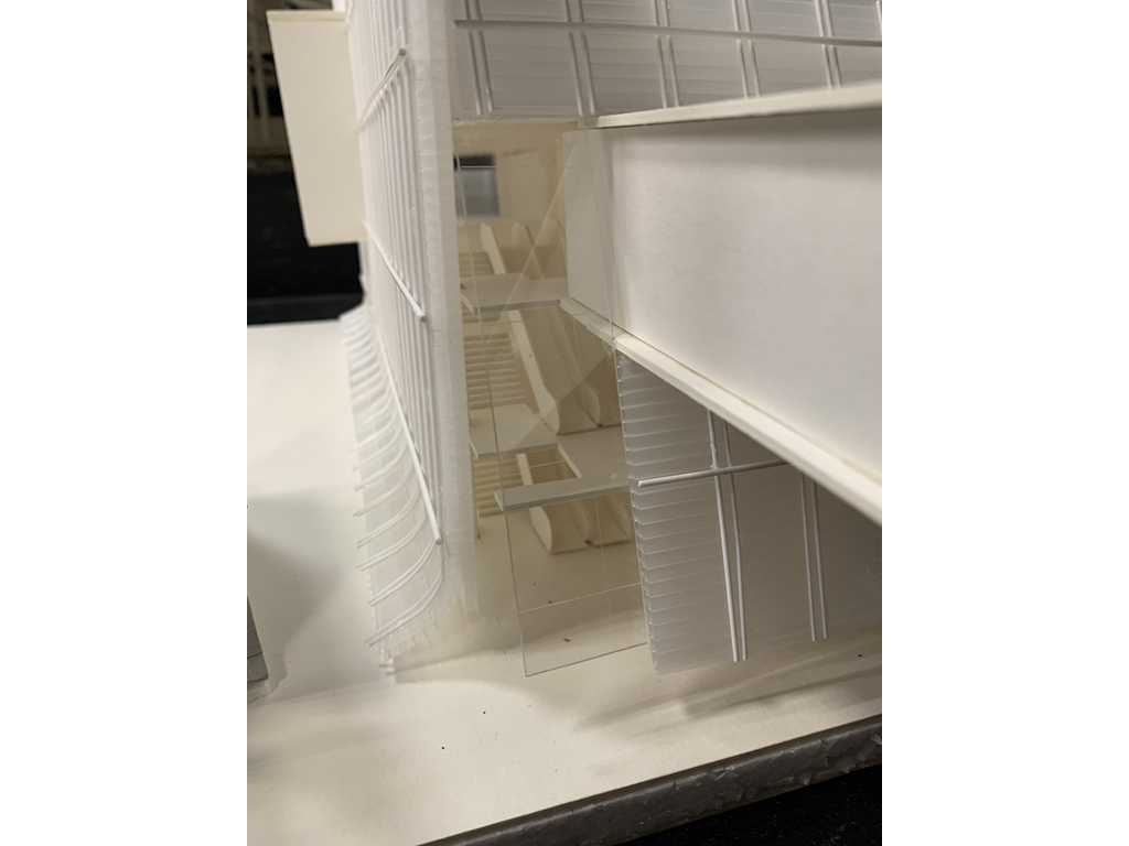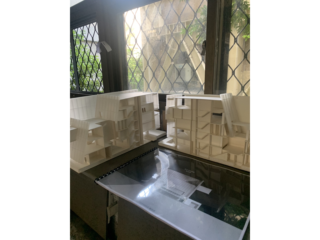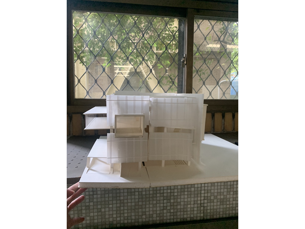 里民服務盒(垂直動線),則是位在左上角,除一樓里民辦公室與垂直動線本身無關因為考慮需連接大馬路方便與外界溝通為由設置,從二樓到五樓分別設置托兒中心、托老中心、桌球場和觀景台、健身房等設施。提供里民基礎的服務以及舒適的運動空間。