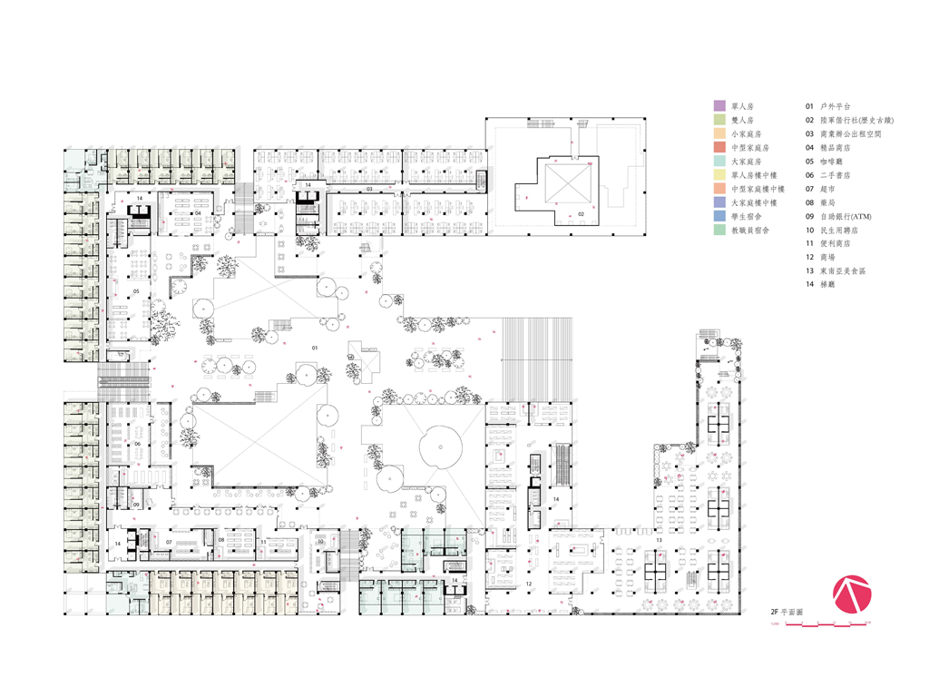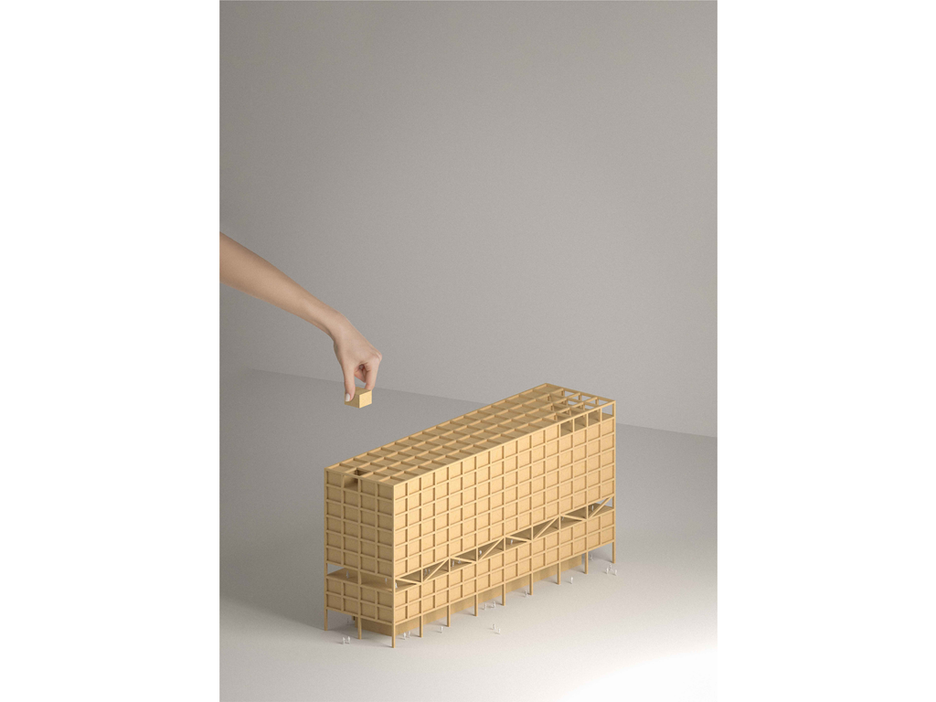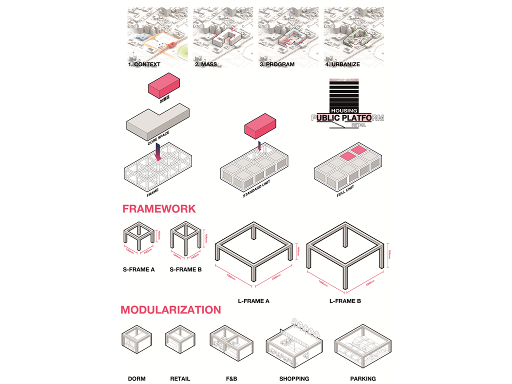 模組化在空間運用與配置上具有無限可能,它們既可以獨立亦可以互相依附,甚至可以堆疊、延展,獨特的模組化空間使我們的設計如同積木般新穎、有趣。從住房單元、小型商店、餐飲、中型零售店甚至地下停車場,這一切都將透過框架在我們的設計中實現。