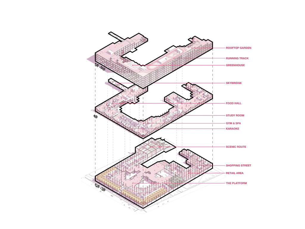 此次設計的主題是在一塊占地約2.6公頃的基地中進行社會住宅設計,基地位於台南火車站前站圓環北側,北門路與公園南路交叉口,有交通與高商業價值的優勢,同時面對現地的東南亞族群生活圈與其豐富的歷史背景,我們對於社宅議題提出新的構想、據基地條件在垂直向度打造公共與商業空間,並提出藉由模矩化的住宅單元來面對現今與未來的不同居住群體。