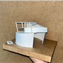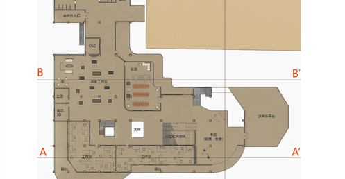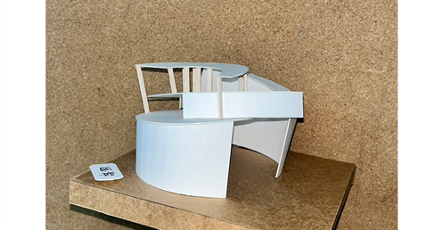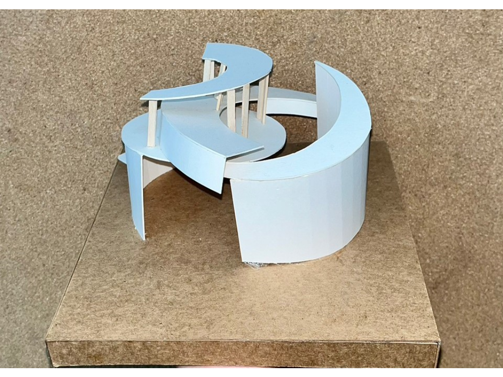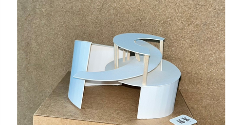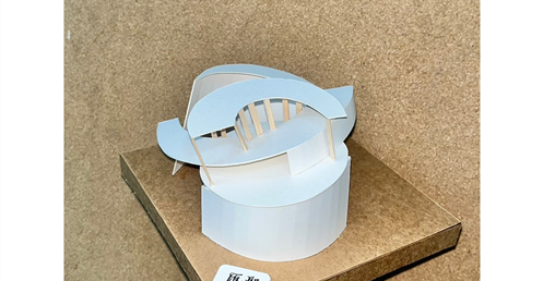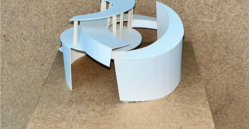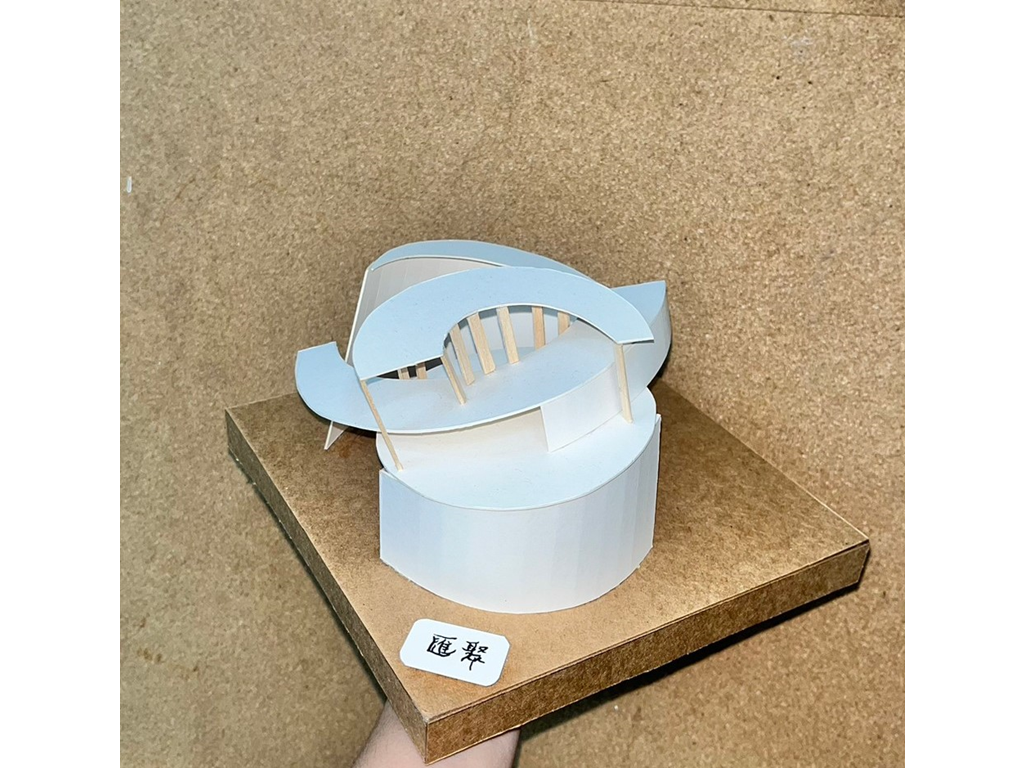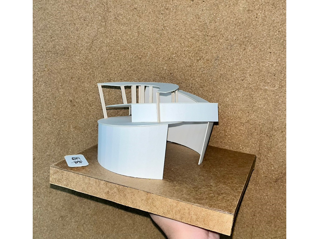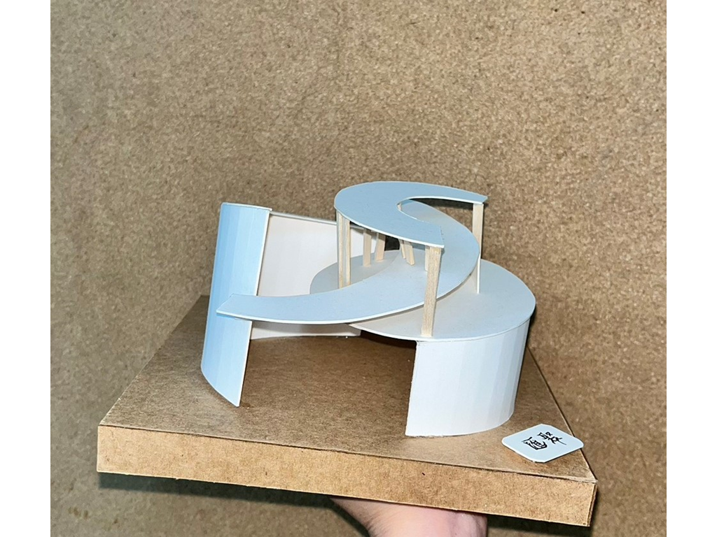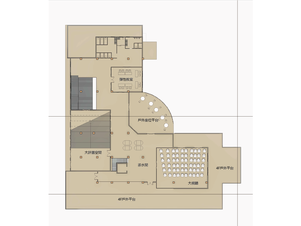 考慮到設計系學生時不時需要靈感的創造,此場地的外型輪廓也因此設有稜角,上下層的平台也有不同的視覺感受。