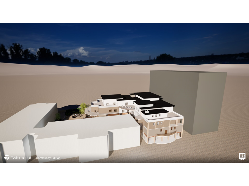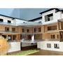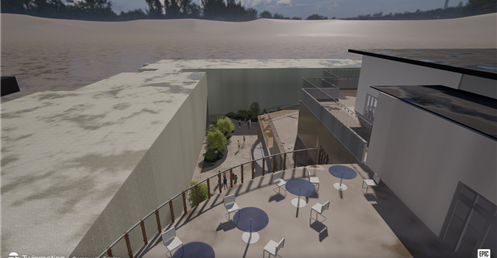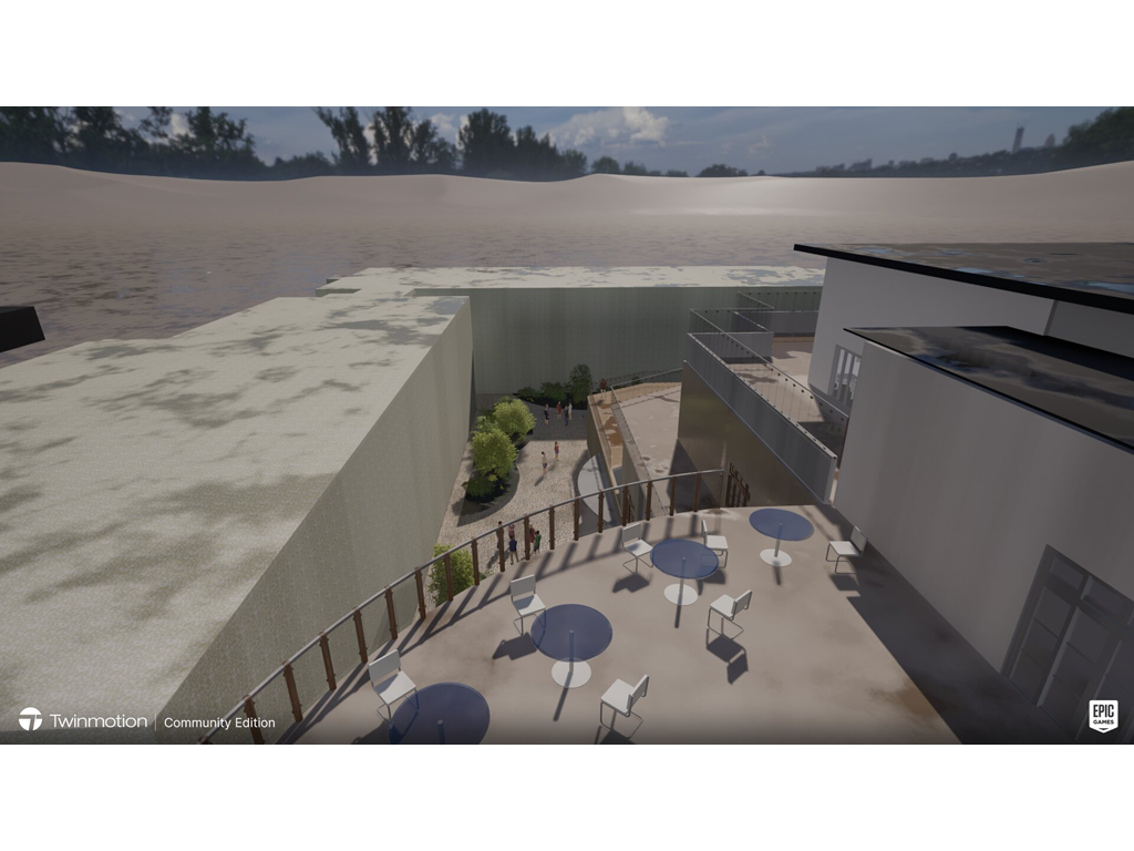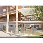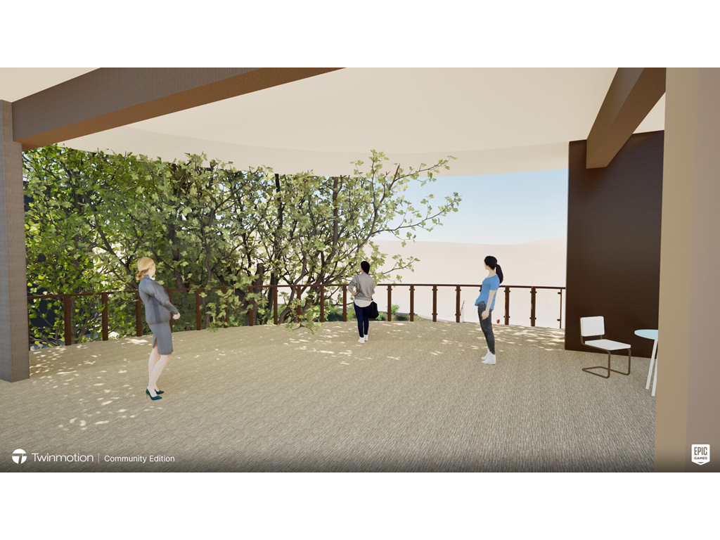 底層的架空設計增加了空間的立體感,同時在視覺上創造了一個與外部環境分隔的區域,這樣的設計既美觀,也富有層次感。半開放的空間既可供小型集會和活動使用,也能夠促進附近的交流。