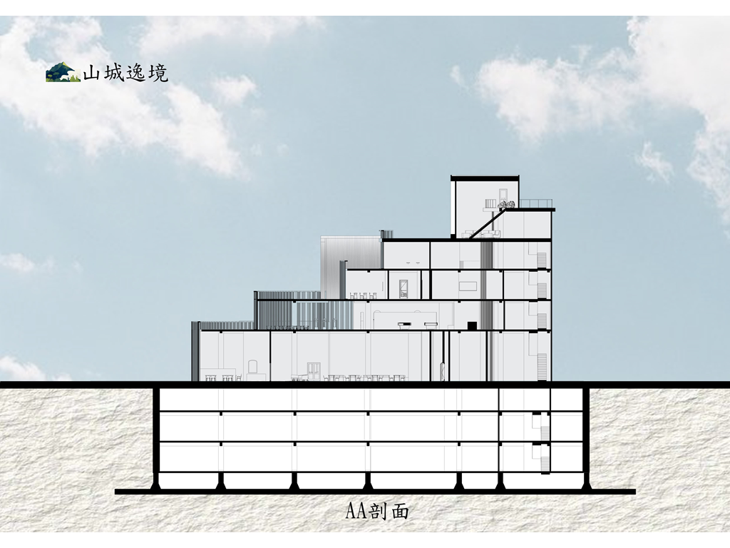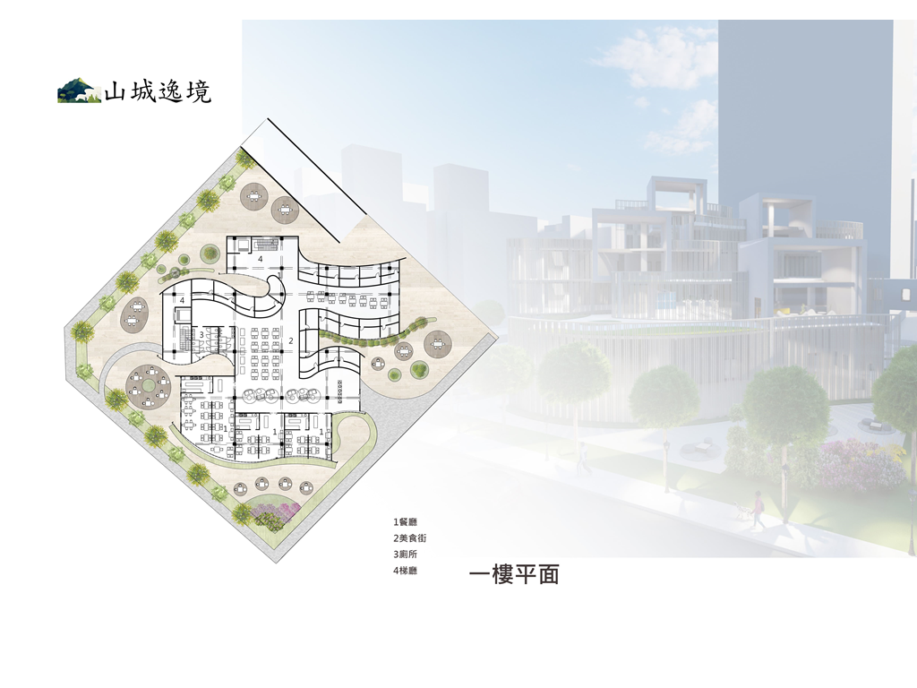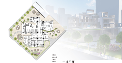 首先整體建築的空間計畫我把他奠定為以交流活動為主的空間,一樓我的量體旋轉了45度側像面對整個城市以前低後高堆疊的方式溫柔的隔絕住宅區與商業區的寧靜與喧嘩,並且創造出一條中軸線完美將原本的公園切割成三個不同性質的小廣場,一個面對城市容納下捷運的人流做為緩衝,一個面對比較寧靜的住宅區圍塑出一個可以自由交流的且具有隱蔽性的小廣場,一個為迎接入口的門面,用三種不同的意境逐漸帶入建築中。一樓動線住要切割為兩個區塊一個為主要通往一樓美食區吸引人流的一個主要入口,其次為一條面對居民的小徑帶入三樓以上的行政社區空間做一個動靜間的切割。二樓主要是健身房,且以休閒空間為媒介連結捷運的通道作為兩者之間的緩衝,三樓以上為行政空間及社區教室服務里民之間的需求