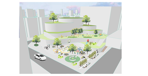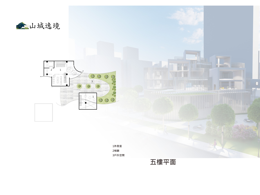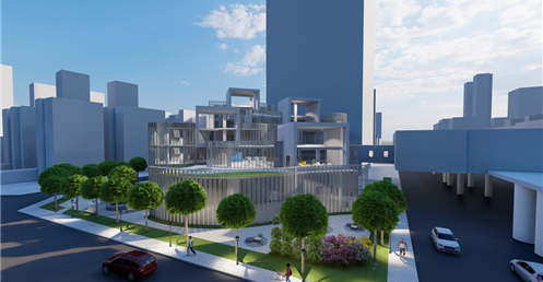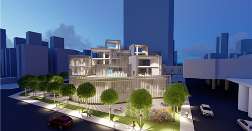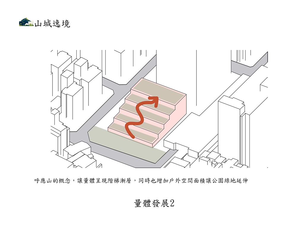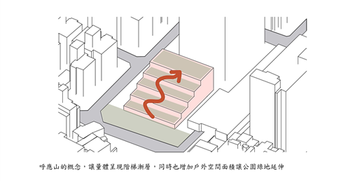 在交通壅塞,步調快速的城市中,打造一個小山坡帶來清淨,並且成為都市中的小驛站,跟隨著波動的流線,緩緩漫步一層一層延伸至最高處,俯視層層的綠地緩緩將綠意慢慢綿延到建築中,為這座城市帶來片刻的閒情逸致。