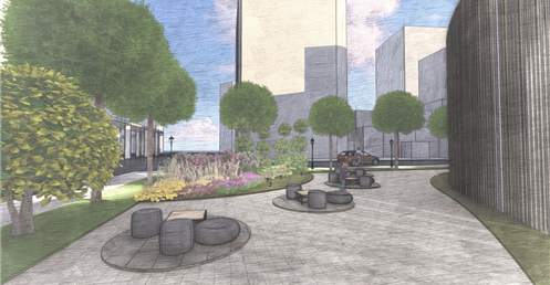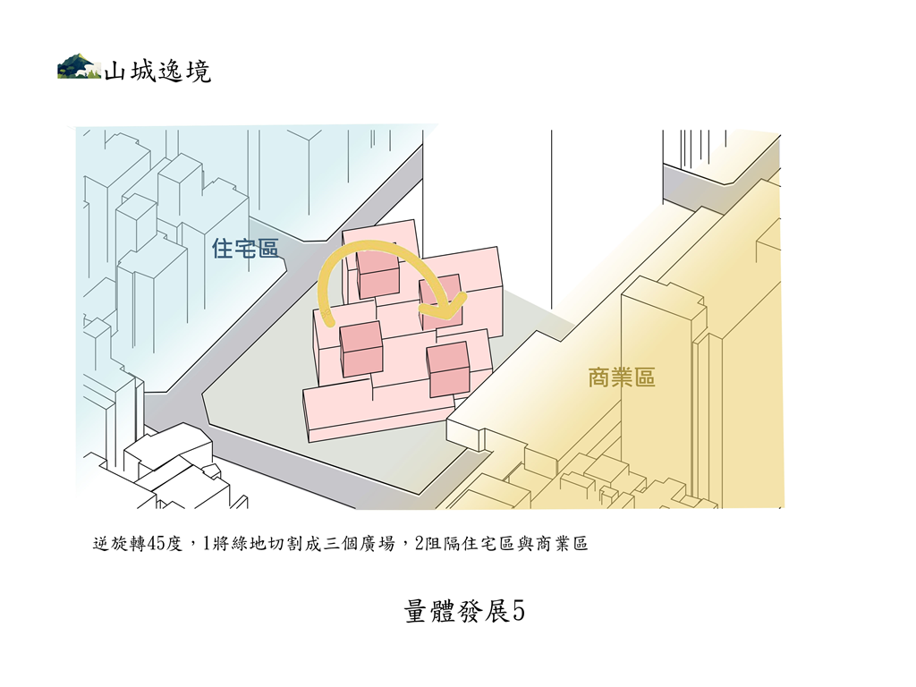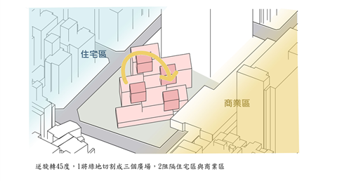 5. 逆時針旋轉45度阻隔住宅區與商業區,且將依樓層面切割為三個不同特性廣場