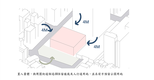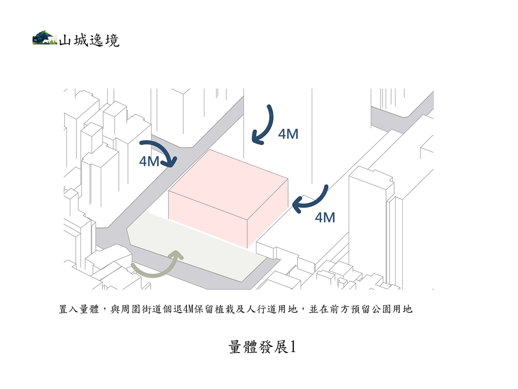 1. 先在基地置入量體並各退縮人行及植栽用地還有公園的空間