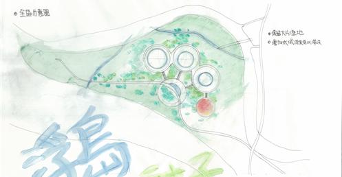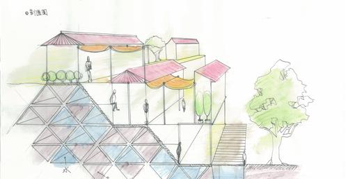 以山城為主要的設計構想,社子島是個低度開發的區域,我希望未來能做到結合住宅、學園與水,形塑出與水的共生環境。以環狀階梯的住宅型態將學員包圍在中心,可以形塑村落的一個共同意識,人人比鄰而居,透過穿插其中的公園、廣場讓孩童更能嬉戲,聚落底下的蓄水幫助降低空氣中的熱度,讓人與水的接觸更為頻繁。