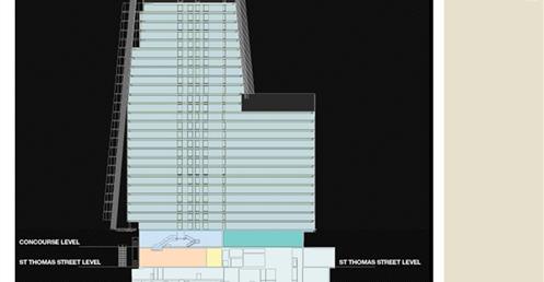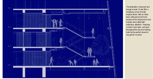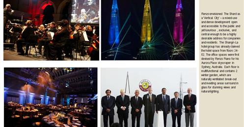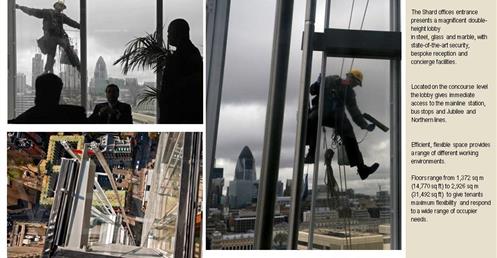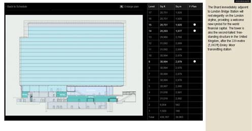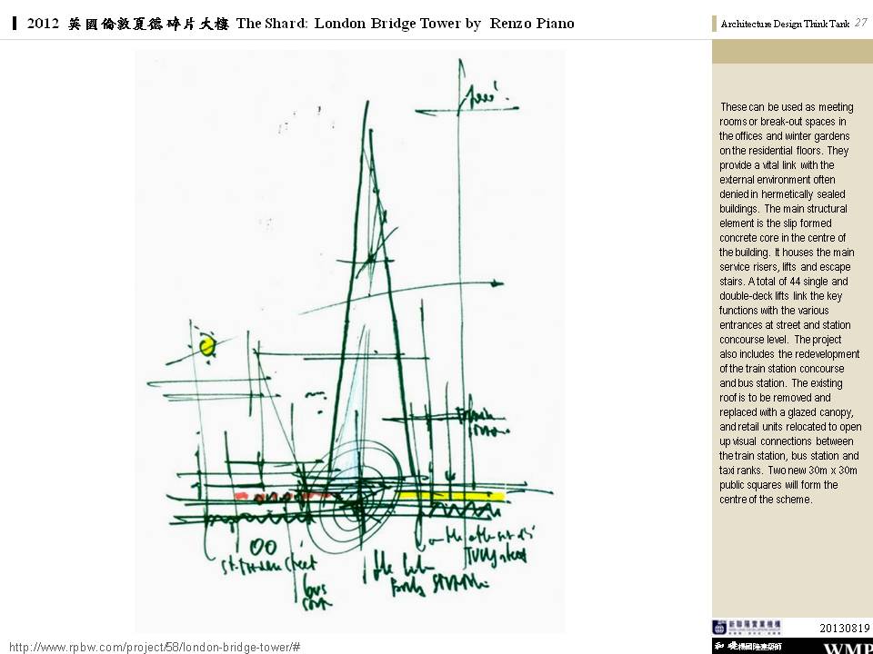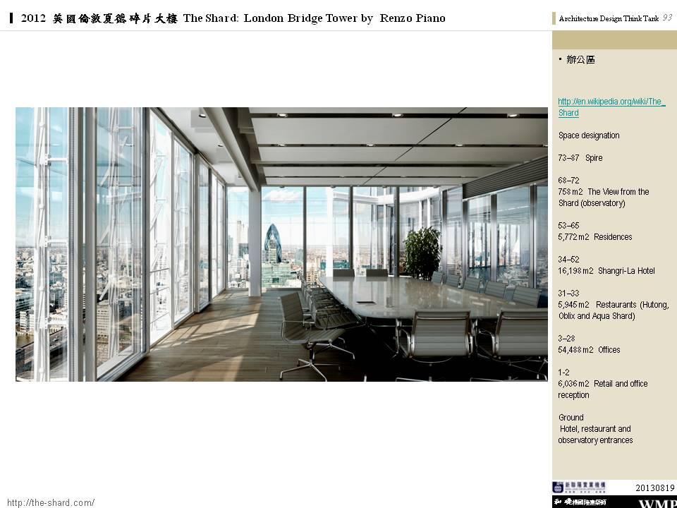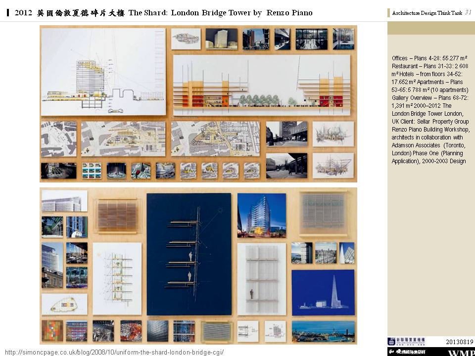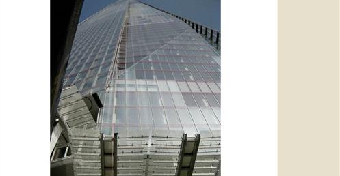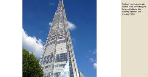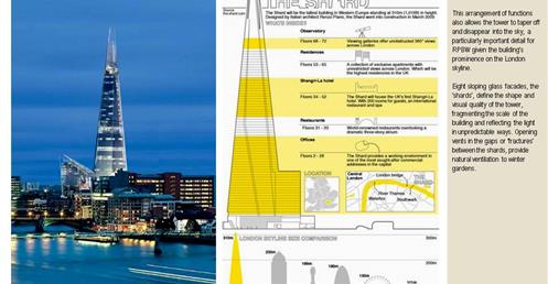 → 皮亞諾:「這棟大樓會呈現輕盈、透明的感覺,就像玻璃碎片。」;複合設施;建築設計概念來自多面向的金字塔、泰晤士河岸邊船舶的船桅、英格蘭南部的細緻尖塔;1萬2000人使用;