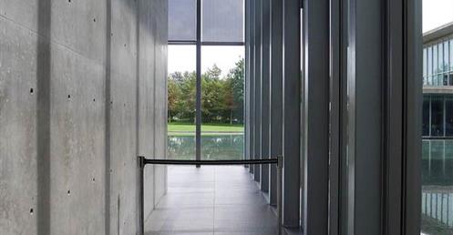 ……此案有別於神戶兵庫縣立美術館,雖然同樣使用熟悉構築材料清水混凝土、玻璃與鋼材,其中少不了水的元素在內,藉由平靜的水面倒影出建築立面所呈現的幾何形體,並且透過安藤擅長的手法,讓建築被廣闊的草原與自然環境圍繞,並以玻璃作為區隔,將自然拉近室內,使人看見其共同存在一隅的畫面;在量體上透過一連串垂直的、水平的簡潔線條、看與被看、既內部也外部、框景層次、虛虛實實..等方式貫注其中。