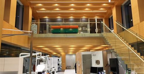 坂茂之作是13年前的設計,鋼構之外由木頭防火疪護成形,期望接待客戶的營業所,有木造建築的溫暖。這家營業額千億以上廣及五大洲的齒科醫療機器公司,對此Showroom滿意極了。