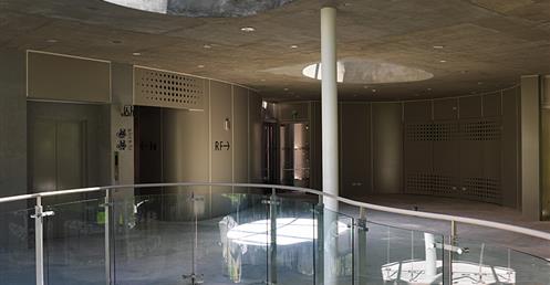將展示空間、大廳、櫃台、休息區、解說區、放映室等空間整合串聯在一起,僅以採光中庭作為區分,形成了「一個」自由流動的空間