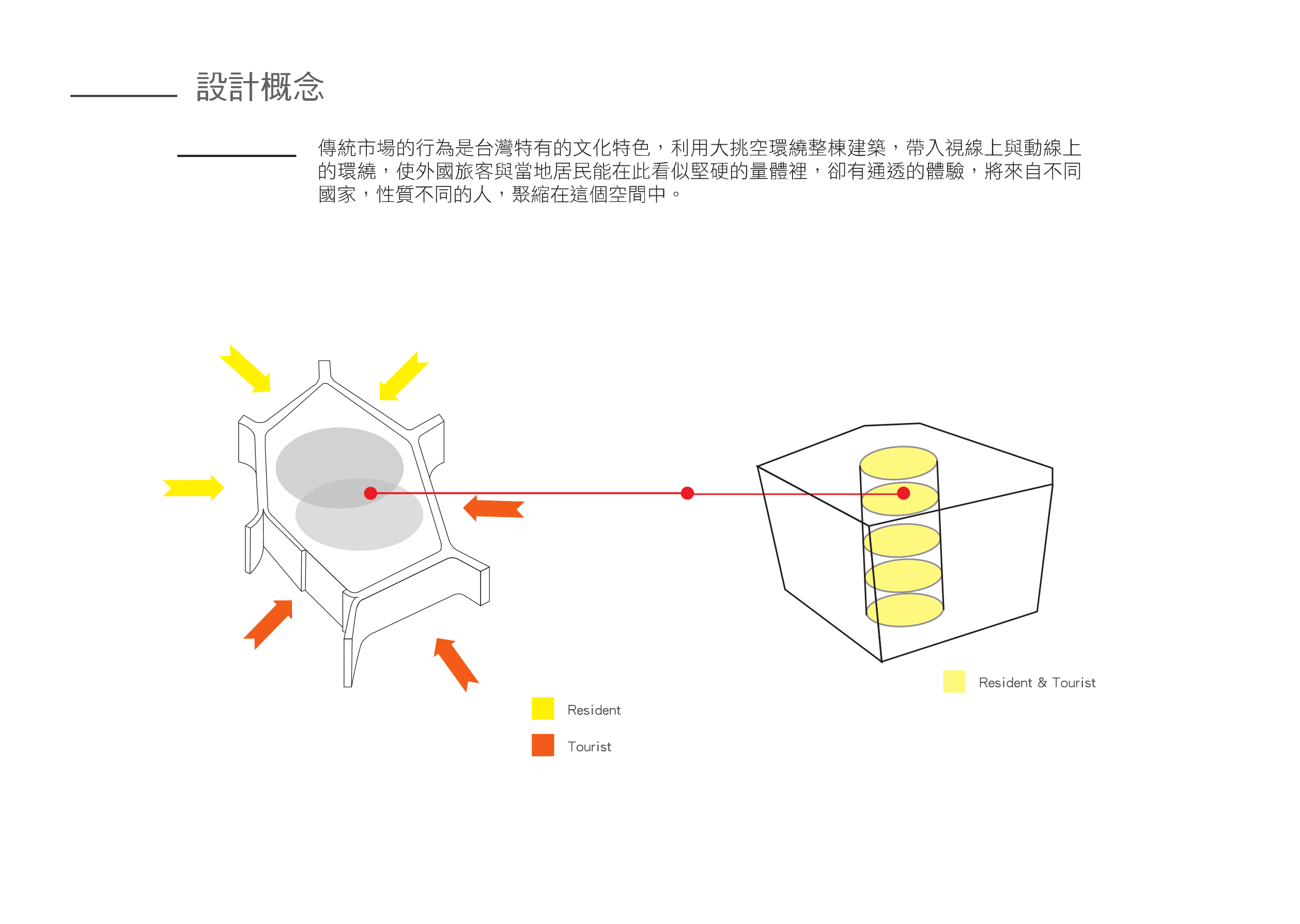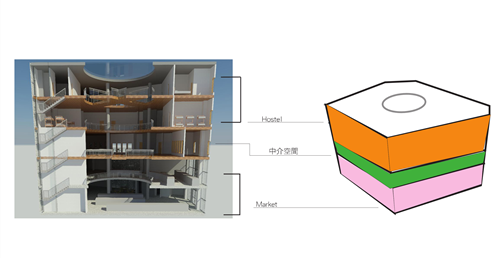 傳統市場的行為是台灣特有的文化特色,利用大挑空環繞整棟建築,帶入視線上與動線上的環繞,使外國旅客與當地居民能在此看似堅硬的量體裡,卻有通透的體驗,將來自不同國家,性質不同的人,聚縮在這個空間中。