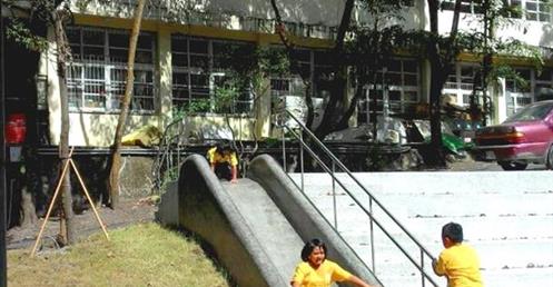 以三合院教室圍塑出中央廣場,結合前方小山坡的大階梯看台,圍塑出完整的四合院,讓學童有個安全舒適的多用途活動場所與戶外劇場。